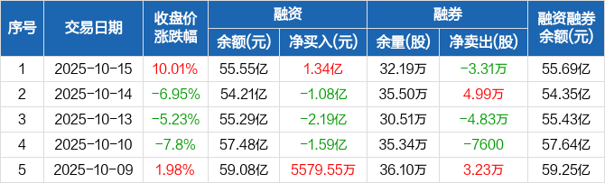 融资方面,当日融资买入14.37亿元,融资偿还13.03亿元,融资净买入1.34亿元。融券方面,融券卖出5.49万股,融券偿还8.8万股,融券余量32.19万股,融券余额1421.98万元。融资融券余额合计55.69亿元。
