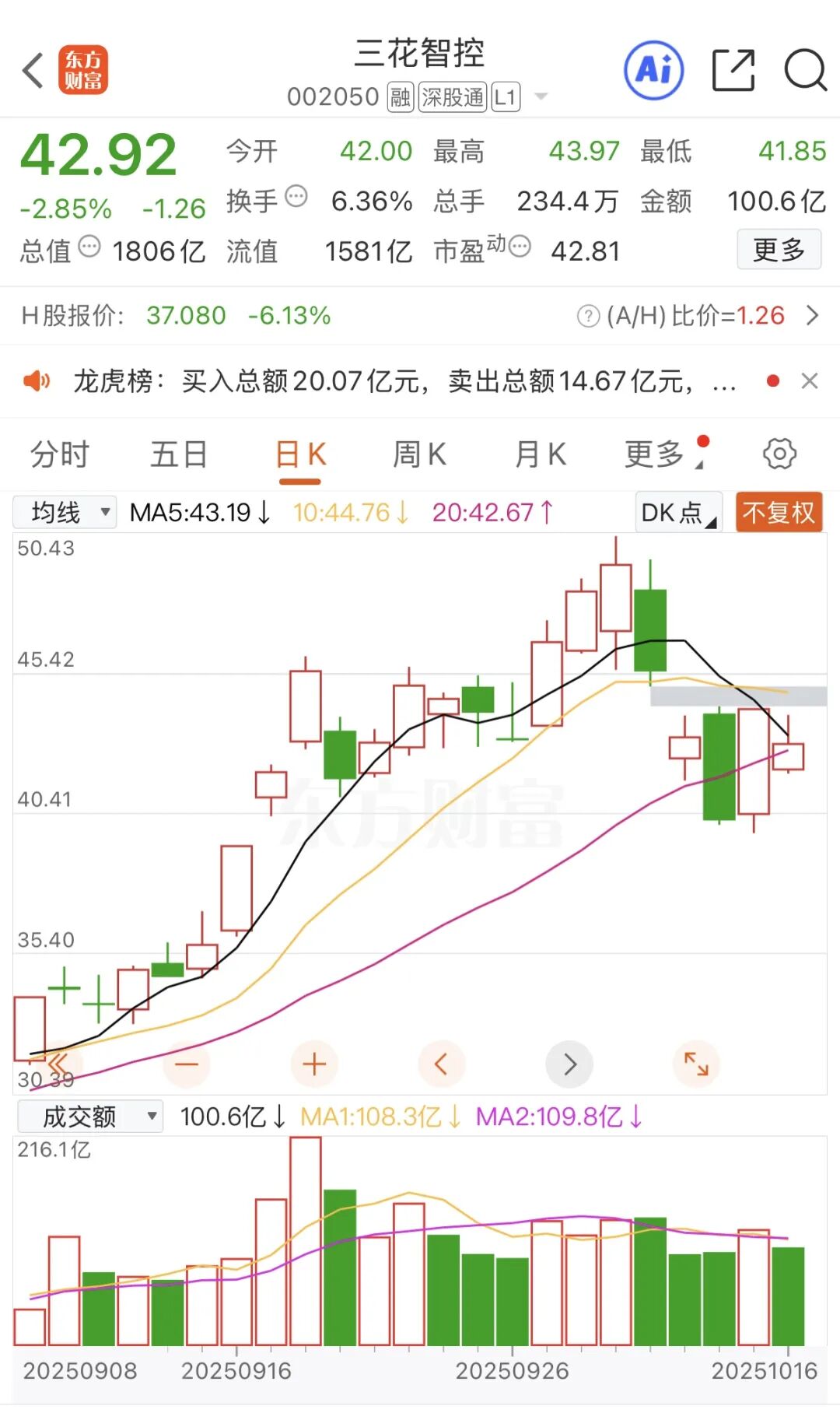 10月16日,三花智控A股收跌2.85%,报42.92元/股;港股收跌6.13%,报37.08港元/股。