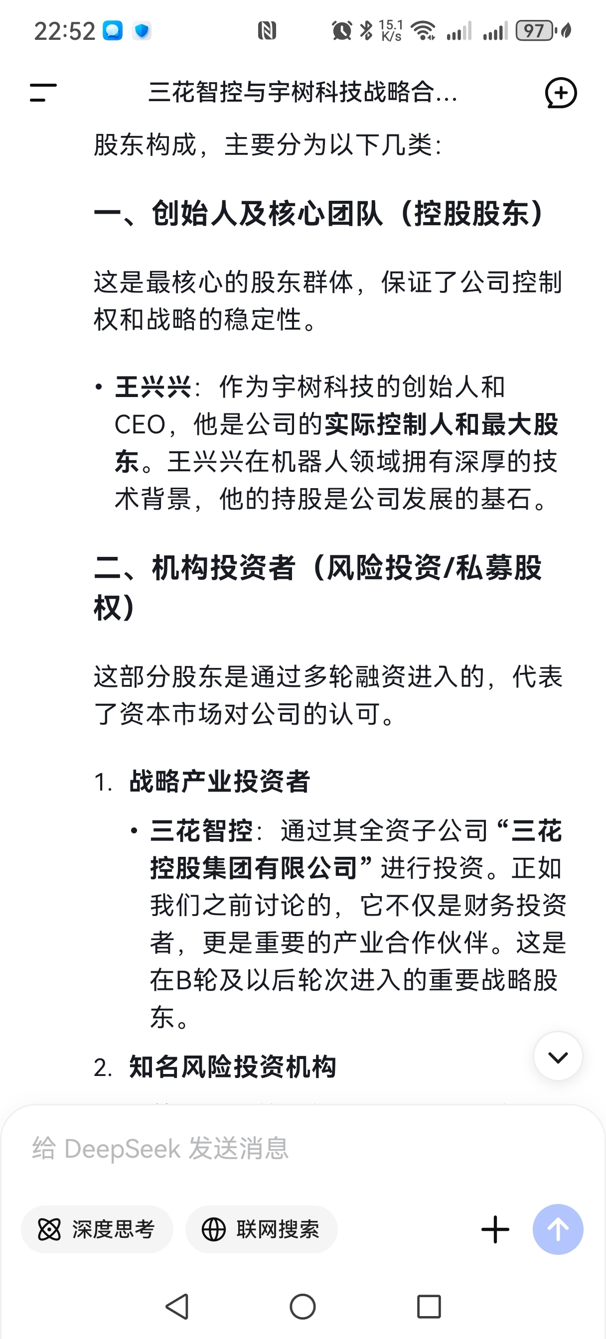 $三花智控(SZ002050)$ 宇树科技就目前几轮融资进展和国家对战略科技领头企业融资支持力度如摩尔线程看,宇树科技大概率2026年上半年完成上市,届时三花作为其股东又是一大笔收益,还有机器人产品及产业合作配套业务!宇树科技肯定会用更多的浙江本土、自己股东、行业领先的三花产品!宇树科技发展好三花自身又是股东,肯定会提供性价比更高的产品,这是其他供应商比不了的!
