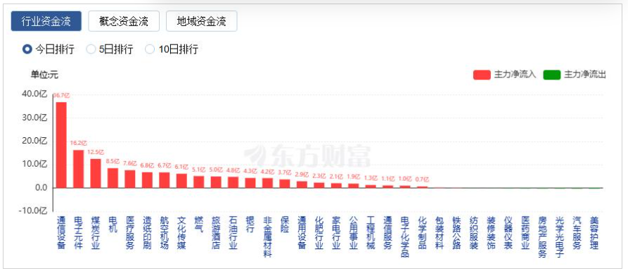行业板块呈现普涨态势,煤炭行业、燃气、非金属材料、电机、航空机场、通信服务、电池、通信设备、消费电子板块涨幅居前,贵金属板块逆市重挫。CPO概念股走强,剑桥科技、瑞斯康达、汇绿生态涨停。超硬材料概念股发力,四方达、黄河旋风先后涨停。煤炭板块持续走强,大有能源5连板,安泰集团3连板。燃气股快速上扬,国新能源5天4板。 行业紫金方面,截至收盘,通信设备、电子元件、煤炭行业等净流入排名靠前,其中通信设备净流入36.74亿。