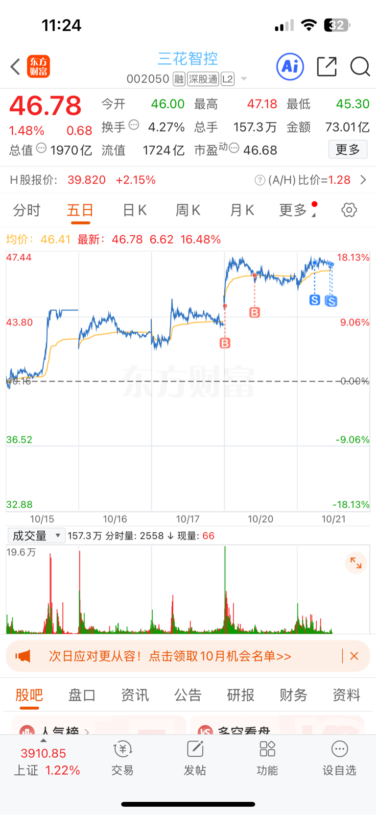 $三花智控(SZ002050)$ 做了个小波段,赚了4万,跌下来我再买你