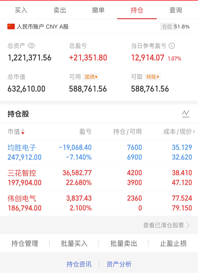 调仓清:锁:三花智控、均胜电子开:伟创电气