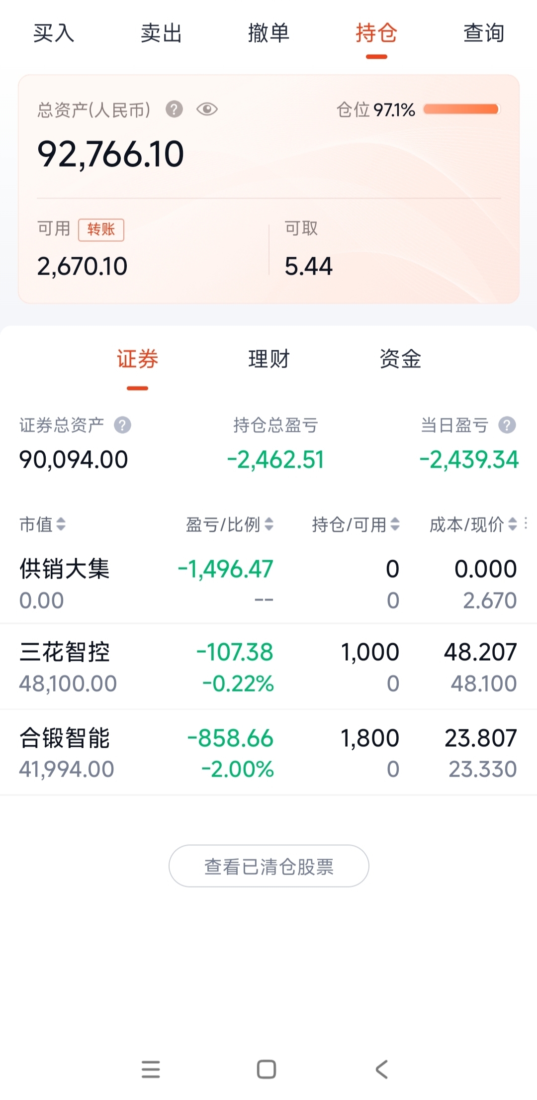 新手宝妈,挪子金库,9万入市,勇闯大A。实盘交易第66天,今日亏损2439元。今日卖出供销大集,买入三花智控和合锻智能。