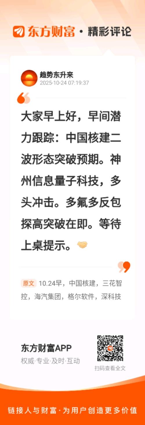 $三花智控(SZ002050)$$神州信息(SZ000555)$$山子高科(SZ000981)$//@趋势东升来 :大家早上好,早间潜力跟踪:中国核建二波形态突破预期。神州信息量子科技,多头冲击。多氟多反包探高突破在即。等待上桌提示。