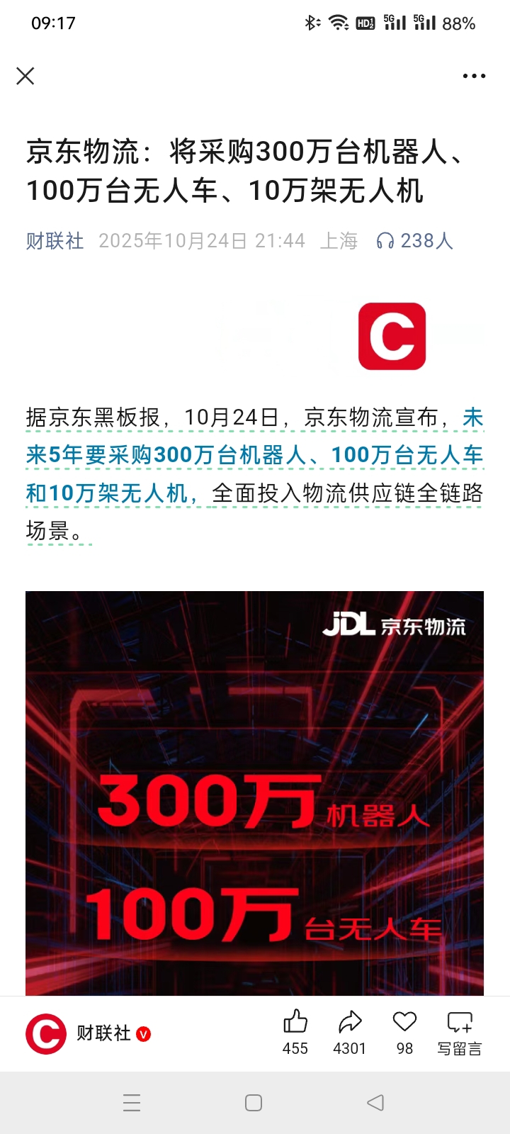 $三花智控(SZ002050)$ 京东采购300万台机器人,利好机器人概念,周一高开高走$双环传动(SZ002472)$ $柯力传感(SH603662)$