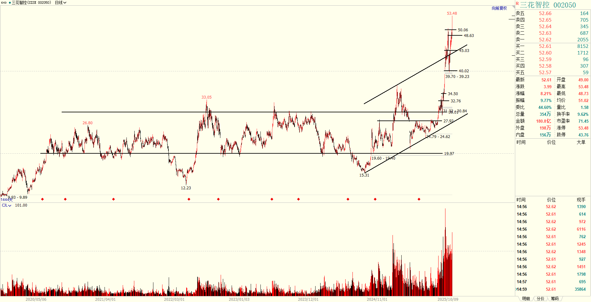 一把直尺打天下/三花智控20-30之间大规模箱体,第一趋势目标60附近;10月2