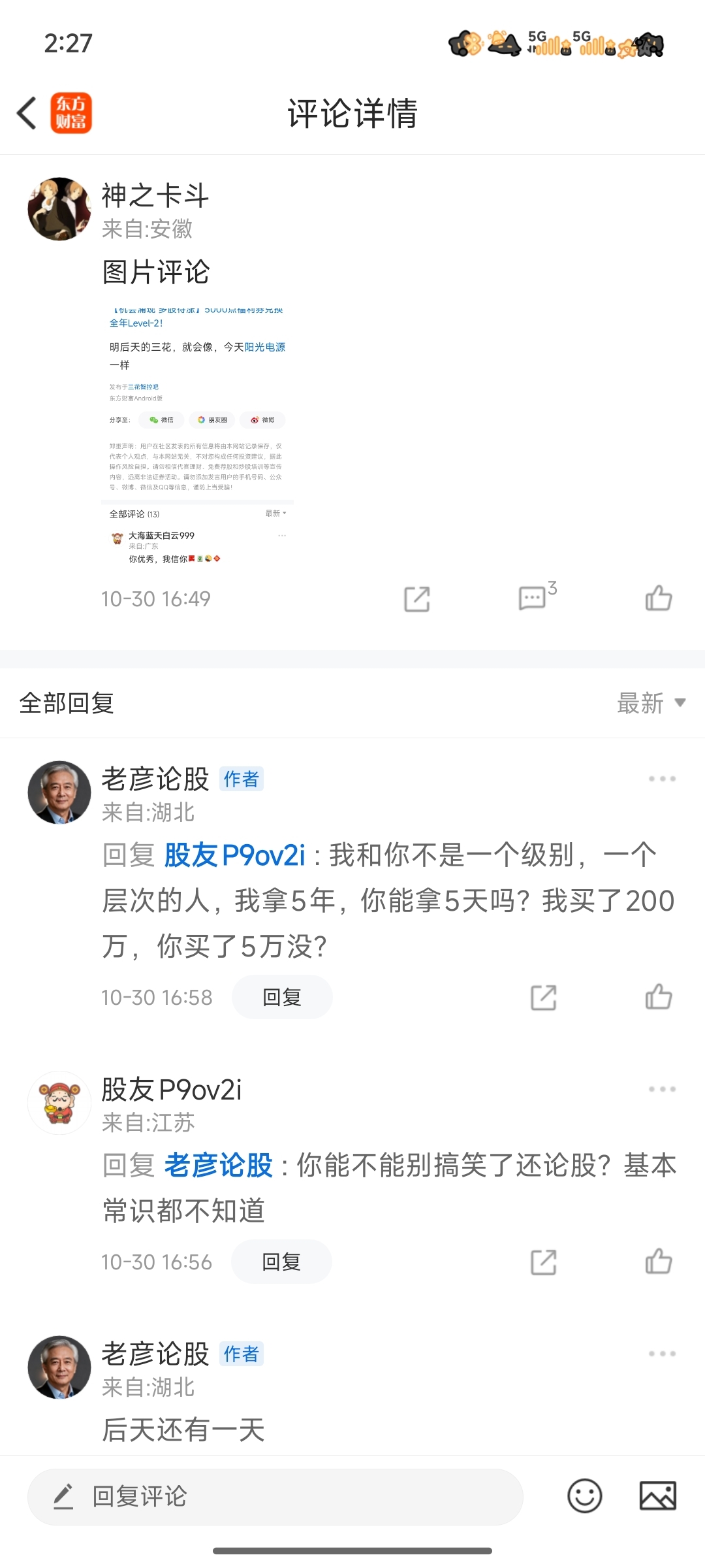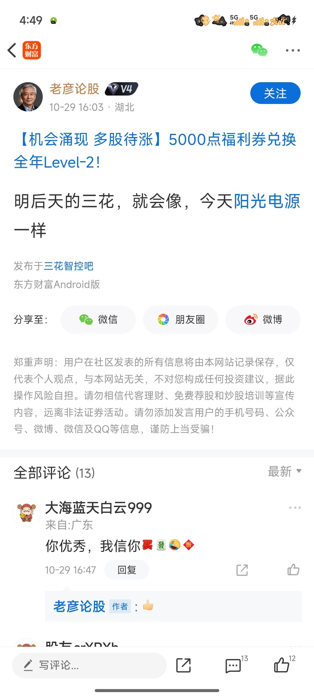 温馨提示: 1.根据《证券法》规定,禁止编造、传播虚假信息或者误导性信息,扰乱证券市场;2.用户在本社区发表的所有资料、言论等仅代表个人观点,与本网站立场无关,不对您构成任何投资建议。用户应基于自己的独立判断,自行决定证券投资并承担相应风险。《东方财富社区管理规定》
