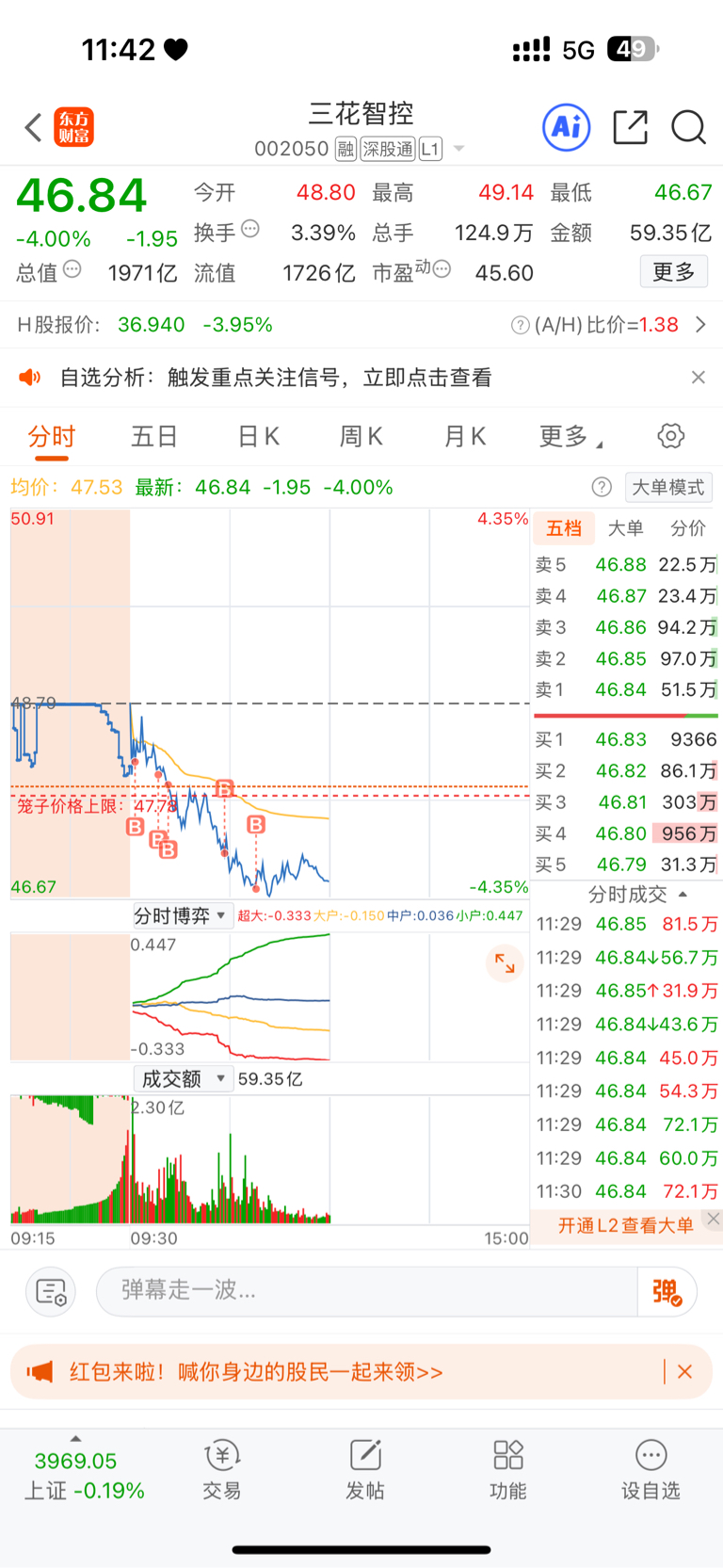 $三花智控(SZ002050)$ 我想抄他的底,他要败我家,53一直补,现在183个在里面,还有50个,你在跌全部补完,杠杠杠