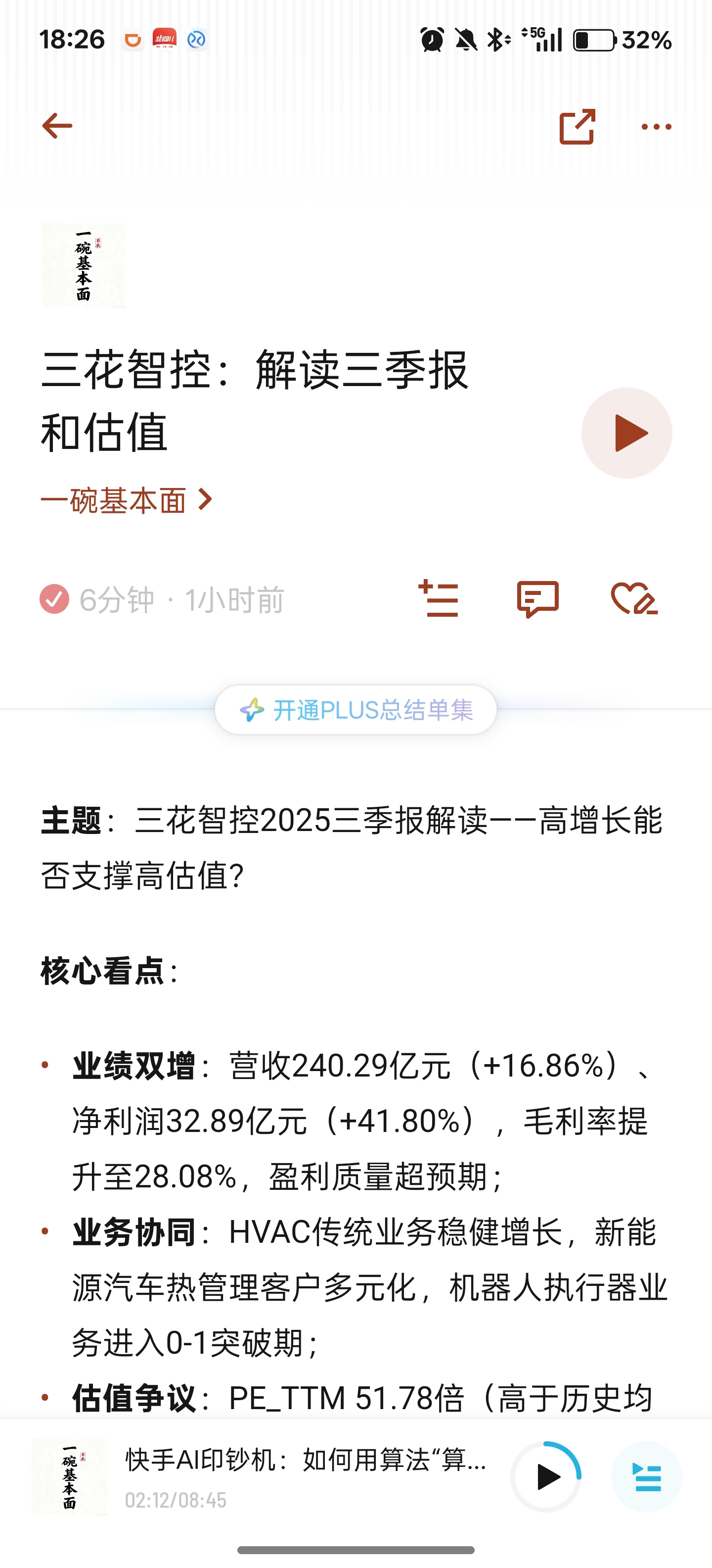$三花智控(SZ002050)$ 小宇宙app,主理人“一碗基本面”,11.5发的一篇关于“三花三季报解读”的播客挺好的,分析的很全面,可以去听听。