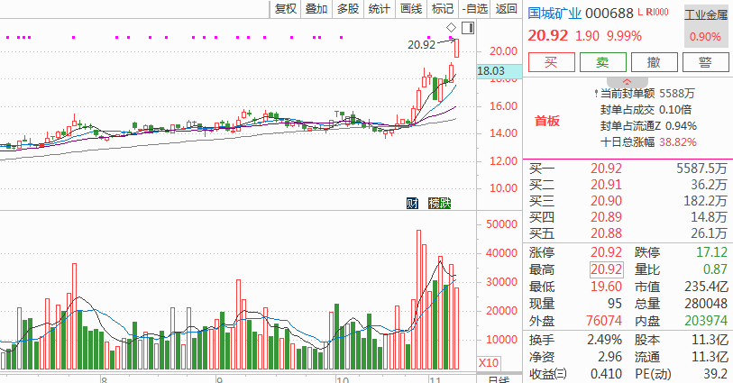 $国城矿业(SZ000688)$,这票是收购题材,这个方向更好的是维信诺,但后者可能还是一字板,而国城矿业周一盘中开板可能反而给予空间。公司是以锌、铅、铜为主要品种的有色金属采选企业,有色板块也进入涨价周期,昨天的涨停主要是一则收购利好,公司拟收购控股股东国城控股集团有限公司持有的内蒙古国城实业有限公司60%股权,金额达31.68亿元,本次交易构成重大资产重组。之后国城实业将成为国城矿业的控股子公司,将增加钼精矿采选业务,增厚优质资源储备,但这行为被称为“蛇吞象”,从三季度看,国城矿业货币z金仅11.92亿元,不足交Y对价的一半。这个估计也是昨天开板的原因,今天看是否在黄金概念板块的助攻下走加速修复。