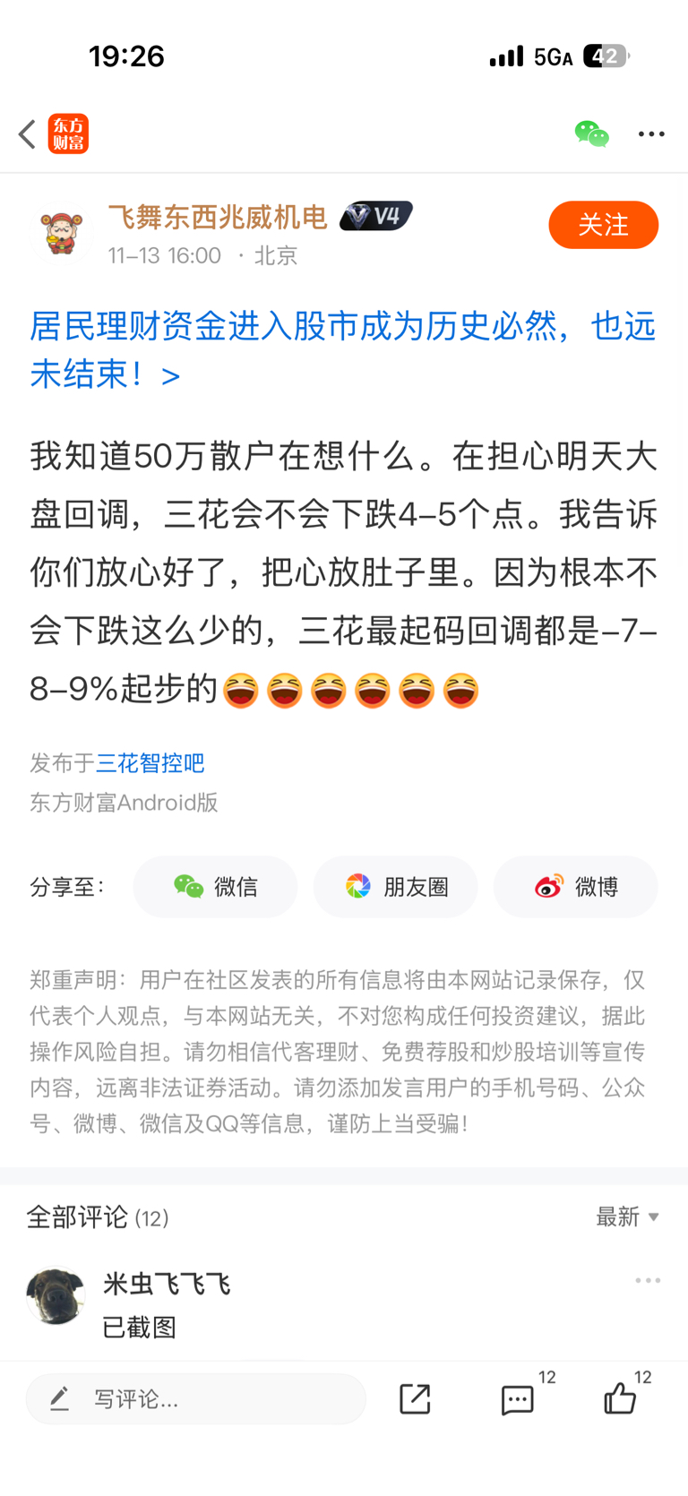 温馨提示: 1.根据《证券法》规定,禁止编造、传播虚假信息或者误导性信息,扰乱证券市场;2.用户在本社区发表的所有资料、言论等仅代表个人观点,与本网站立场无关,不对您构成任何投资建议。用户应基于自己的独立判断,自行决定证券投资并承担相应风险。《东方财富社区管理规定》