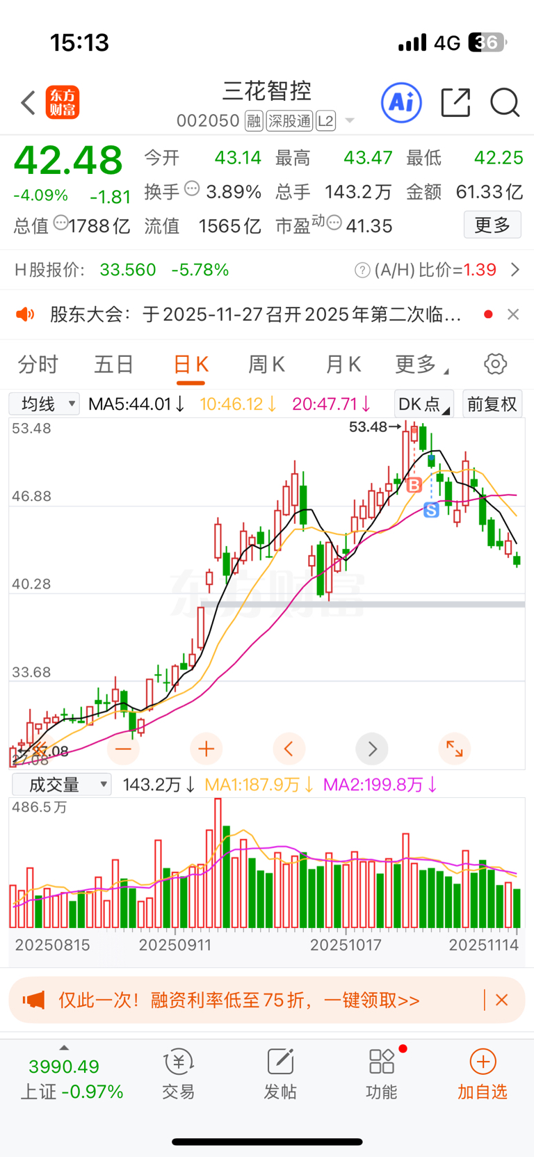 $三花智控(SZ002050)$ dy被忽悠进来,还好跑得快 小亏当赢
