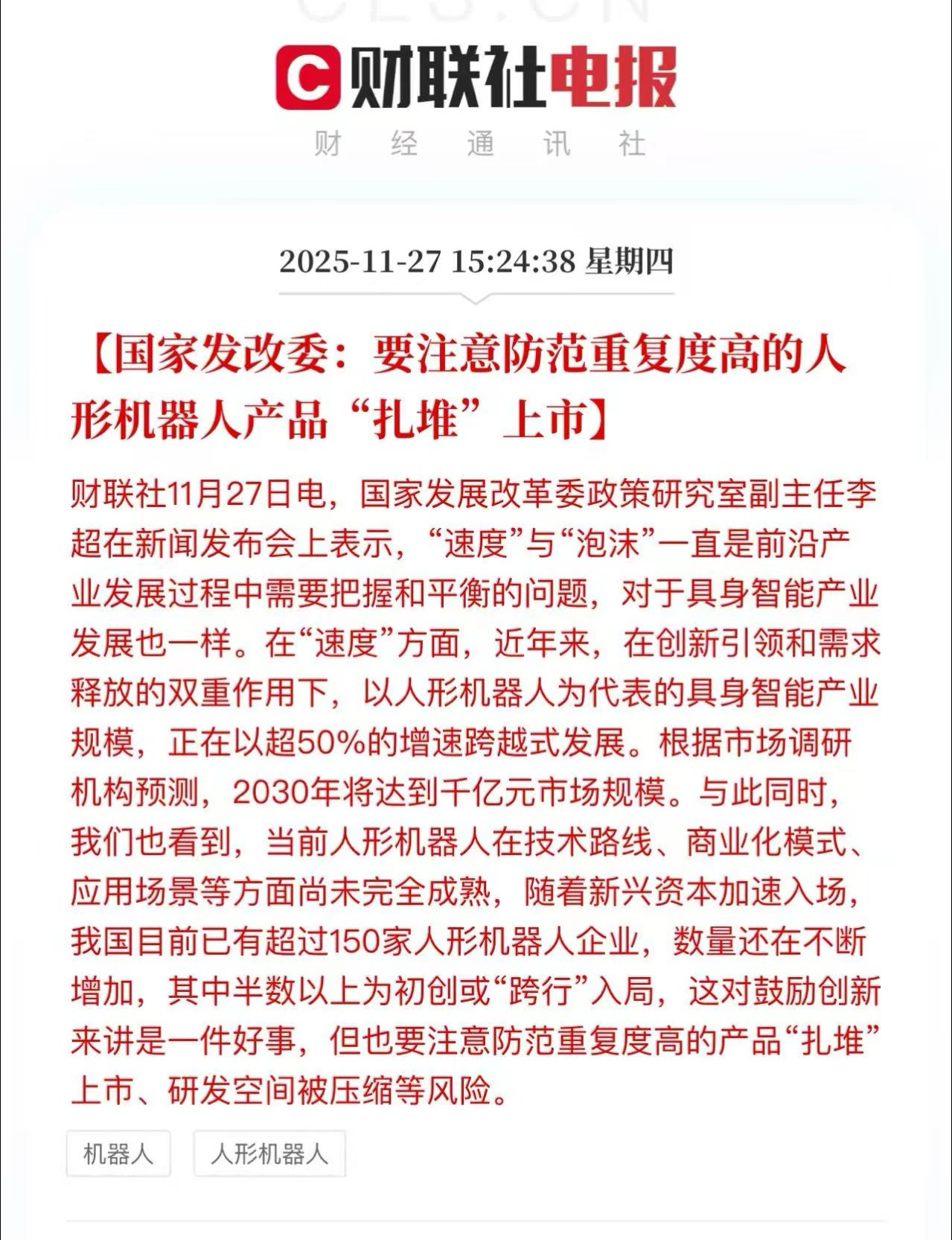 这个新闻对现有机器人板块是利好,意思是再有想参与机器人业务的公司,审批会考核其布局方向,对于已有多家企业布局的方向,审批就会很严。