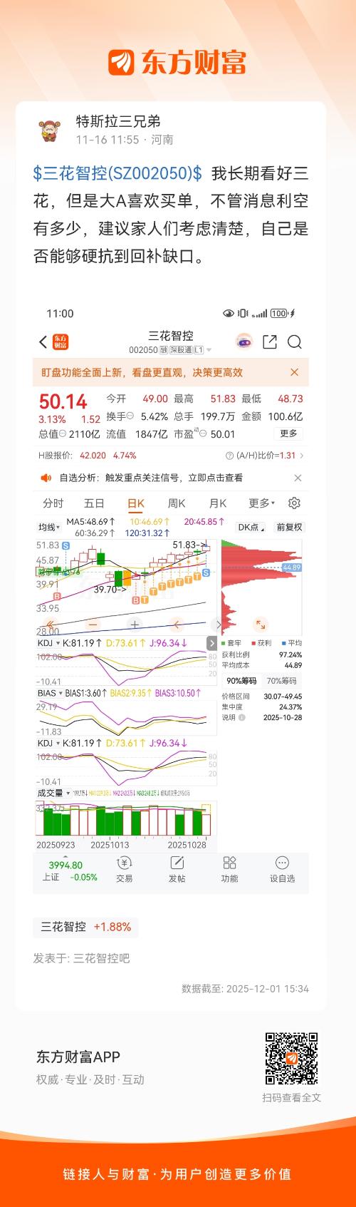 $三花智控(SZ002050)$ 我长期看好三花,但是大A喜欢买单,不管消息利空有多少,建议家人们考虑清楚,自己是否能够硬抗到回补缺口。