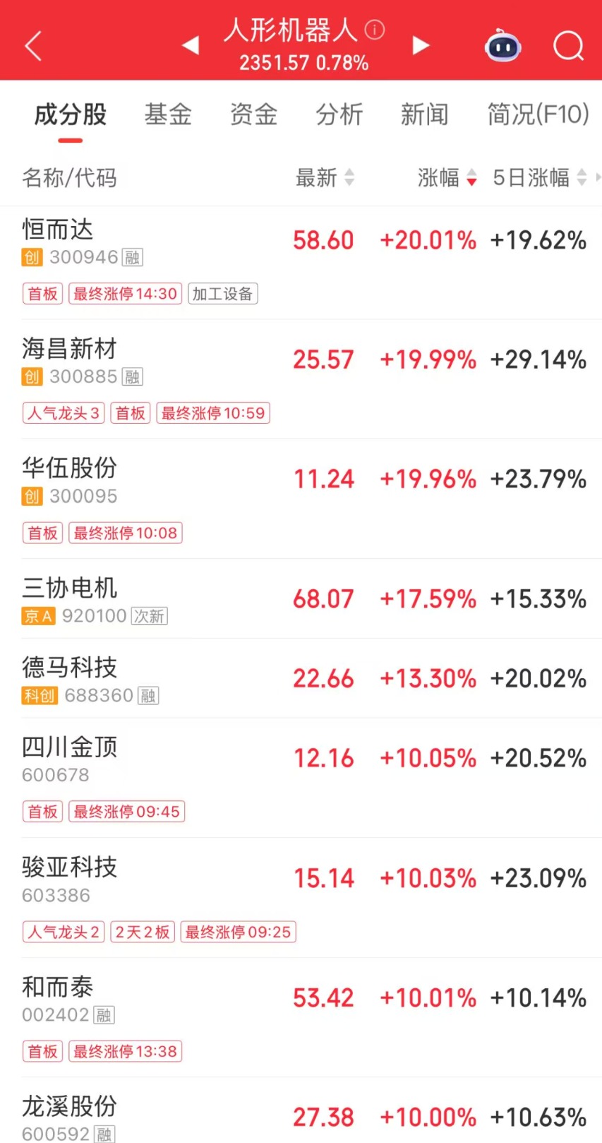 今日,人形机器人板块走强,恒而达、海昌新材、华伍股份均“20CM”涨停,四川金顶、骏亚科技、和而泰等多股涨停。