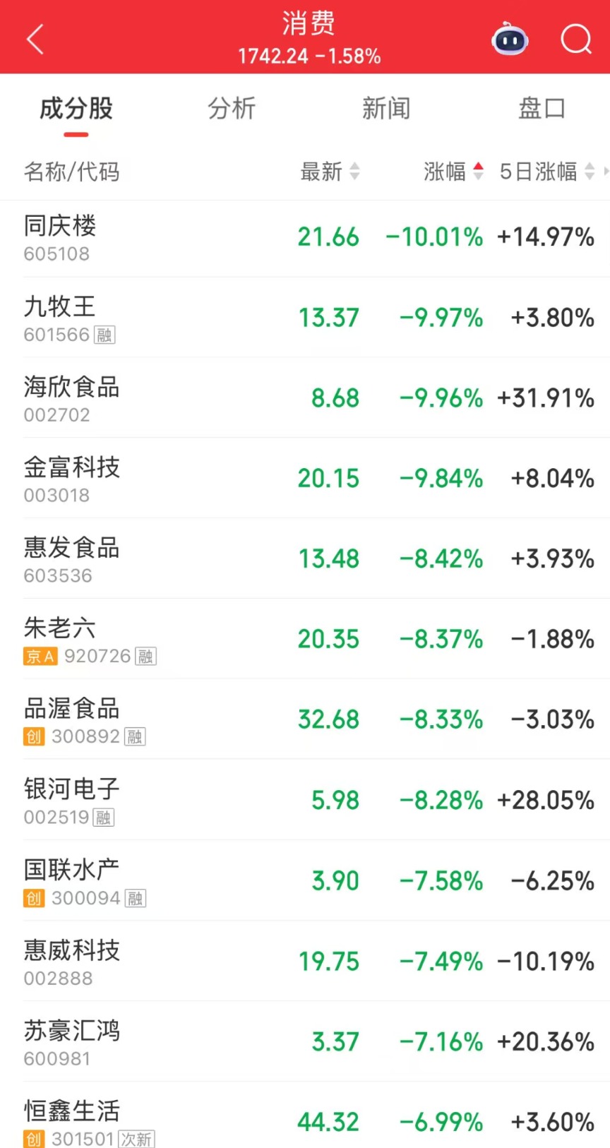 今日,大消费板块中食品、乳业等多个分支概念走弱。同庆楼、海欣食品等前期大涨股均跌停。惠发食品、朱老六、品渥食品等跌幅居前。