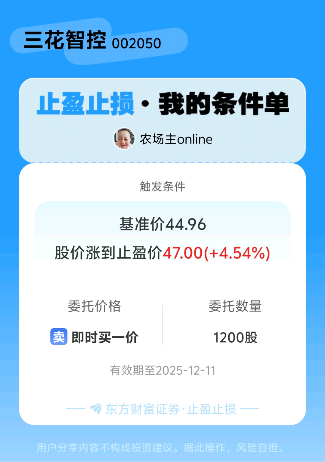 #条件单交流# #止盈止损晒单# 一位股神设置了一个止盈止损条件单,接下来就是见证奇迹的时刻~$三花智控(SZ002050)$