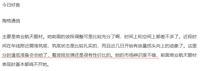 她属于商业航天题材,是题材内的低位气质谷,题材内的高位谷打开空间高度,低位的有补张预期啊,主要是这么个逻辑。上周五发掘了她,近几日开始底部企稳向上,目前筹码结构捋顺了,那么后面还有反弹预期啊,目前上方没什么阻力了。继续锚定五均线上方跟踪行情即可。