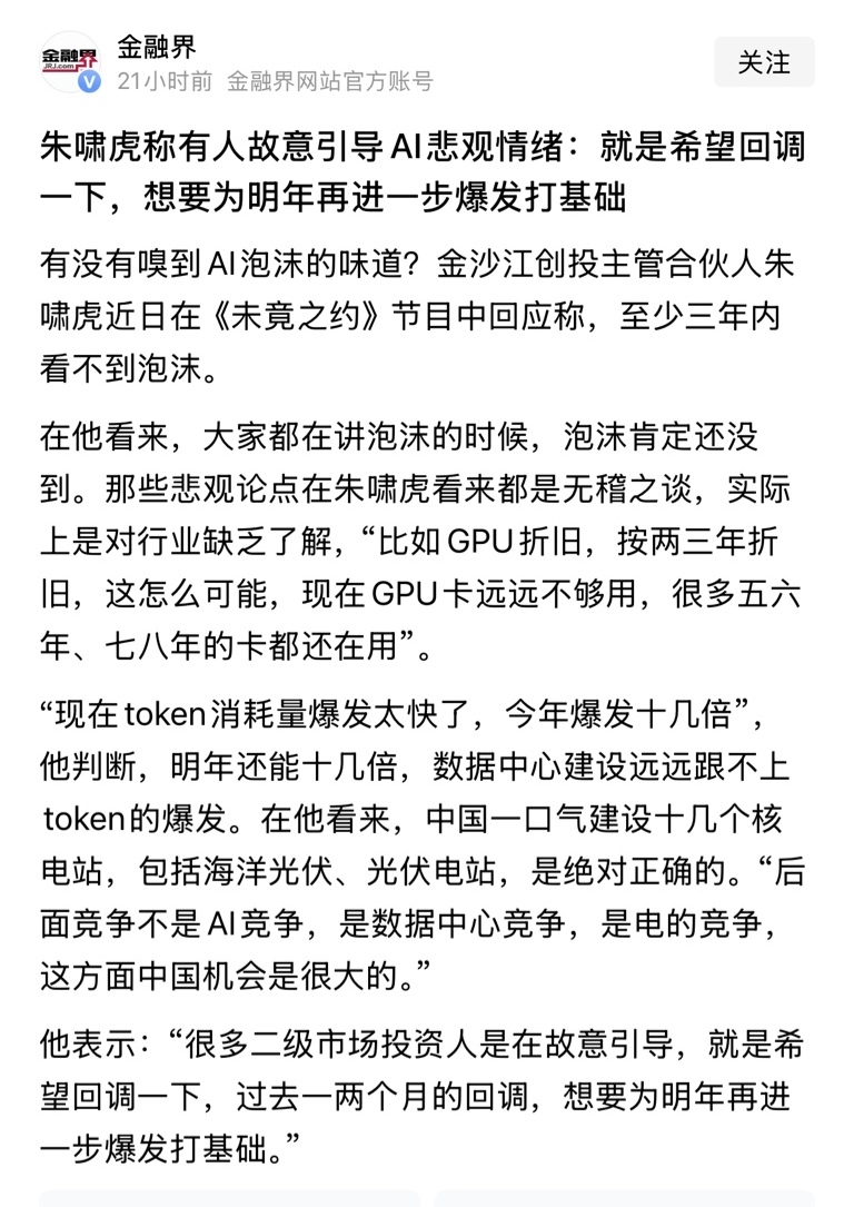 朱啸虎称有人故意引导AI悲观情绪:就是希望回调一下,想要为明年再进一步爆发打基础