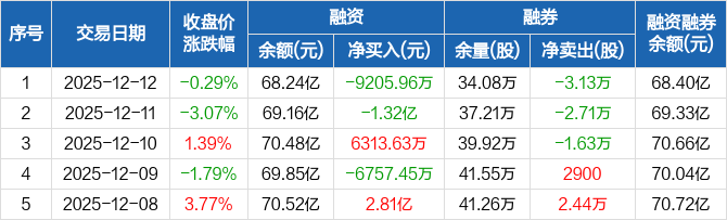三花智控:融资净偿还9205.96万元,融资余额68.24亿元(12-12)