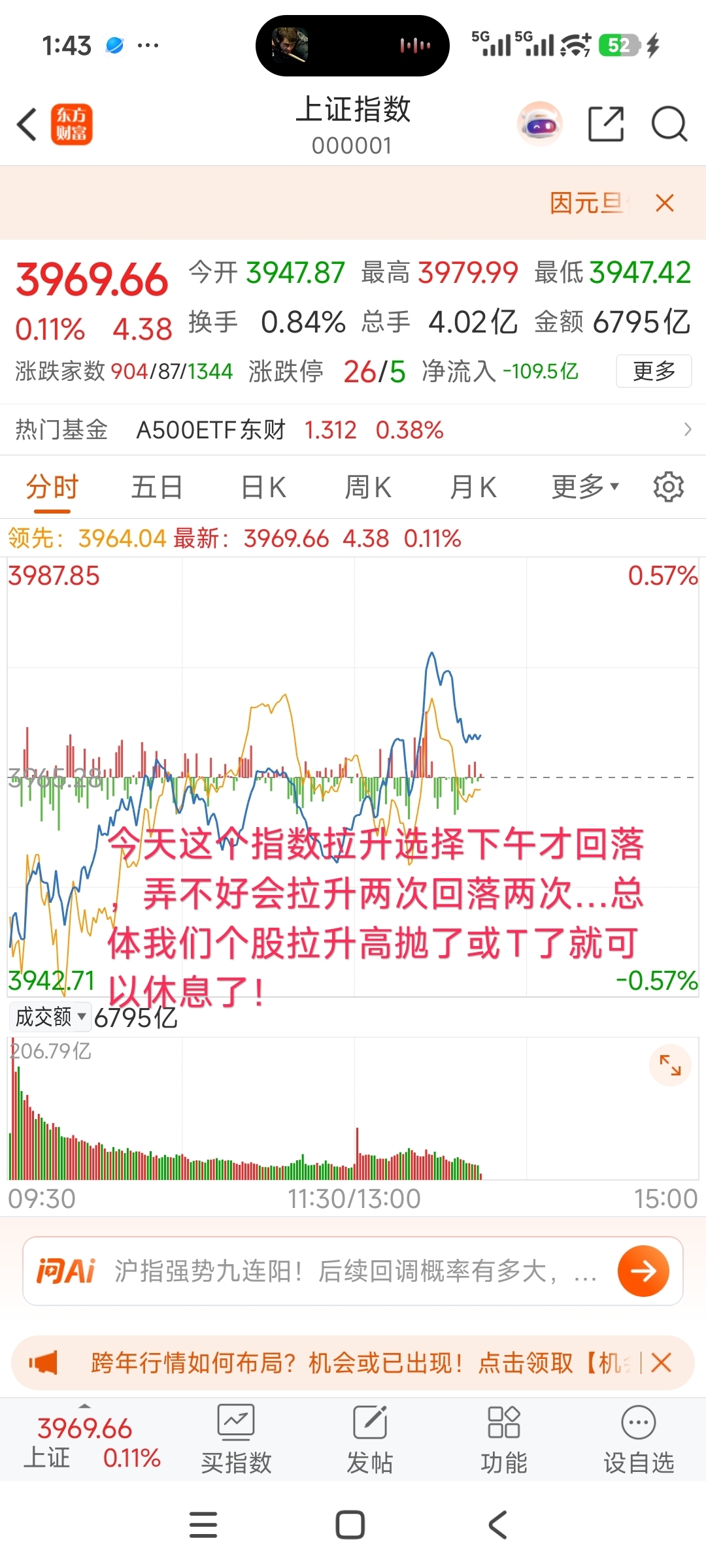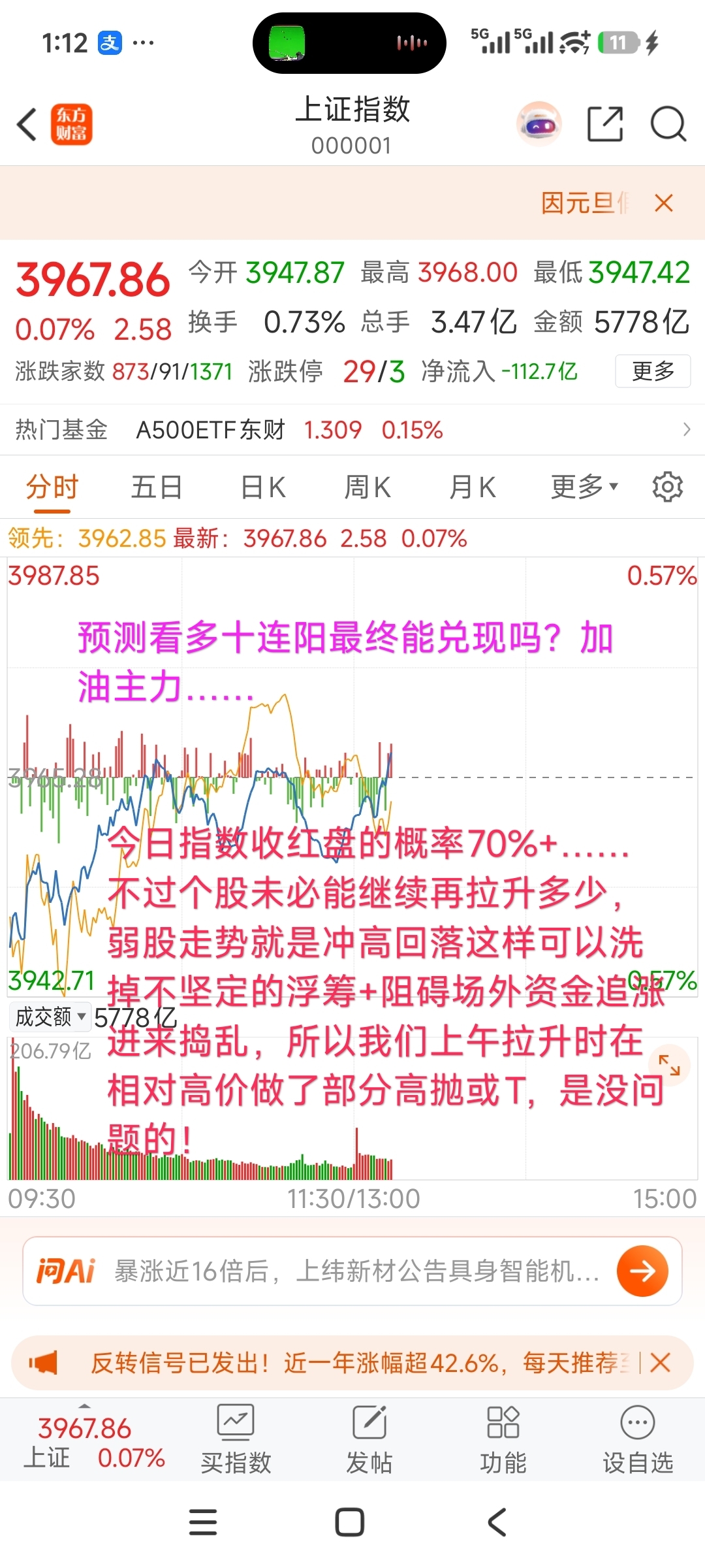 今日指数收红盘的概率70%+……不过个股未必能继续再拉升多少,弱股走势就是冲高回落这样可以洗掉不坚定的浮筹+阻碍场外资金追涨进来捣乱,所以我们上午拉升时在相对高价做了部分高抛或T,是没问题的!