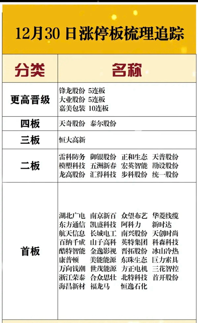 12.30周二涨停板股票:连板高度!10连板嘉美包装5连板大业股份5连板锋龙股份
