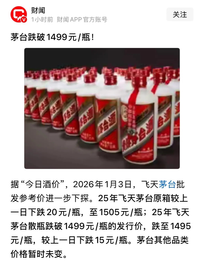 飞天茅台跌破1499元:1月3日好消息,每天浪费半小时这几天根本抢不到茅台的人有利好消息来了,贵州飞天茅台跌破了1499元,目前跌到了1495元,每买一瓶亏4元。2021年在白酒基金顶峰我曾在全网第一个给亿万基民和股民提示风险:2021年滴酒不沾,关注我看到此精准预判的几十万粉丝逃顶,躲过了白酒板块的五年大跌。这个观点到2025年,2026年依然没有改变,因为下跌趋势没有改变,2026年继续滴酒不沾,提示白酒板块风险。#强势机会# #复盘记录# #炒股日记# $三花智控(SZ002050)$ $蓝色光标(SZ300058)$ $利欧股份(SZ002131)$