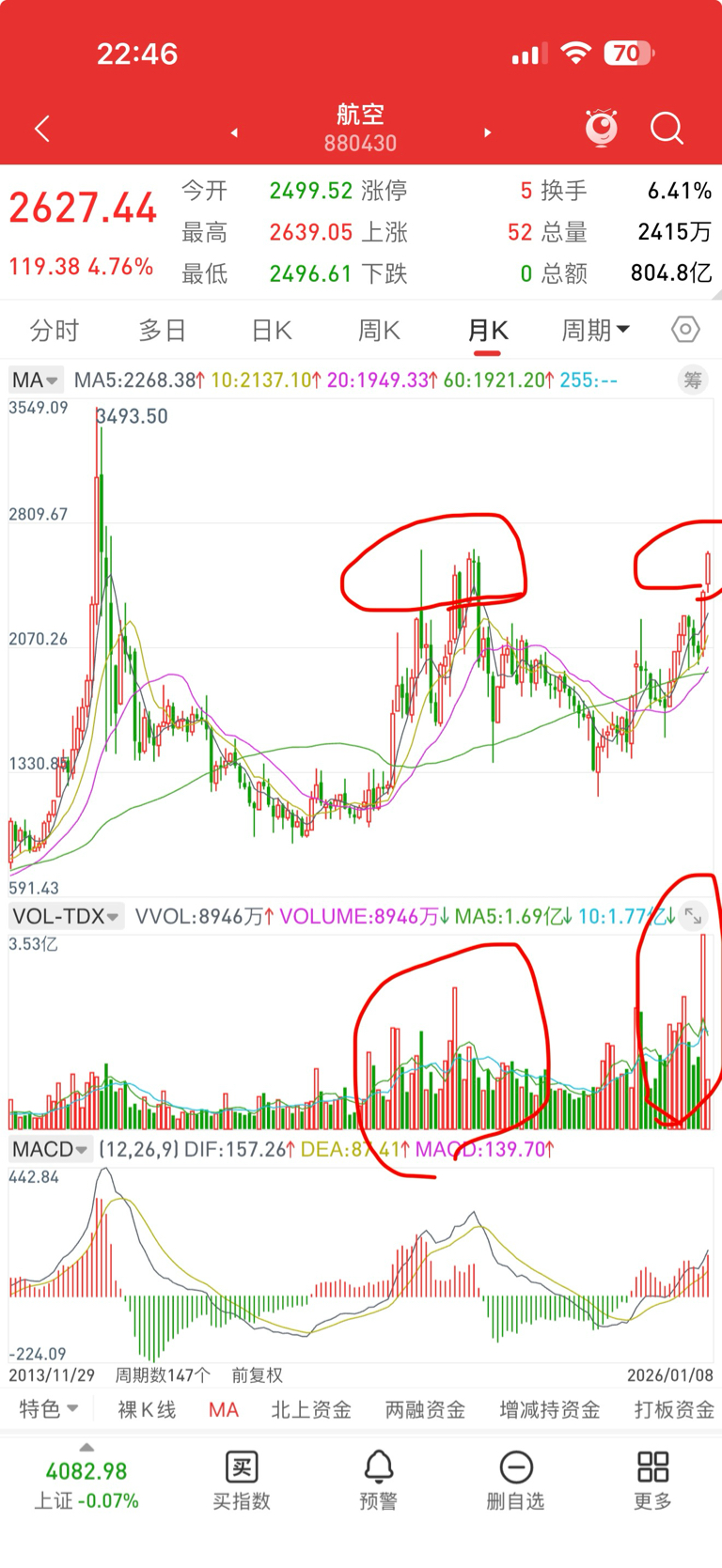 商业航天按照量价关系来讲,明天有可能天空突破几年前的平台最高点,往上就是晴空万里