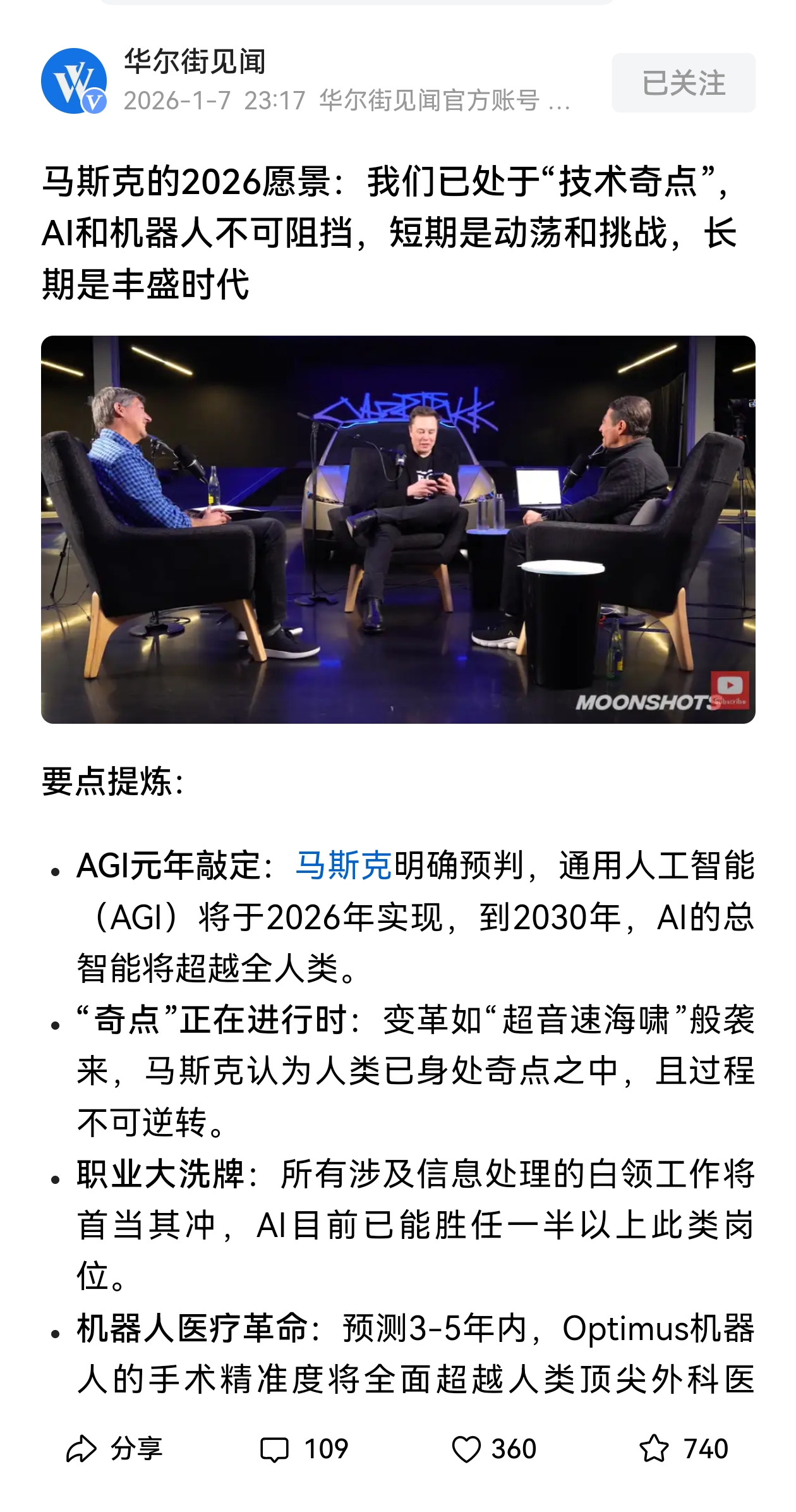 马斯克预言,到2040年,机器人的数量将达到“100亿台甚至更多”。