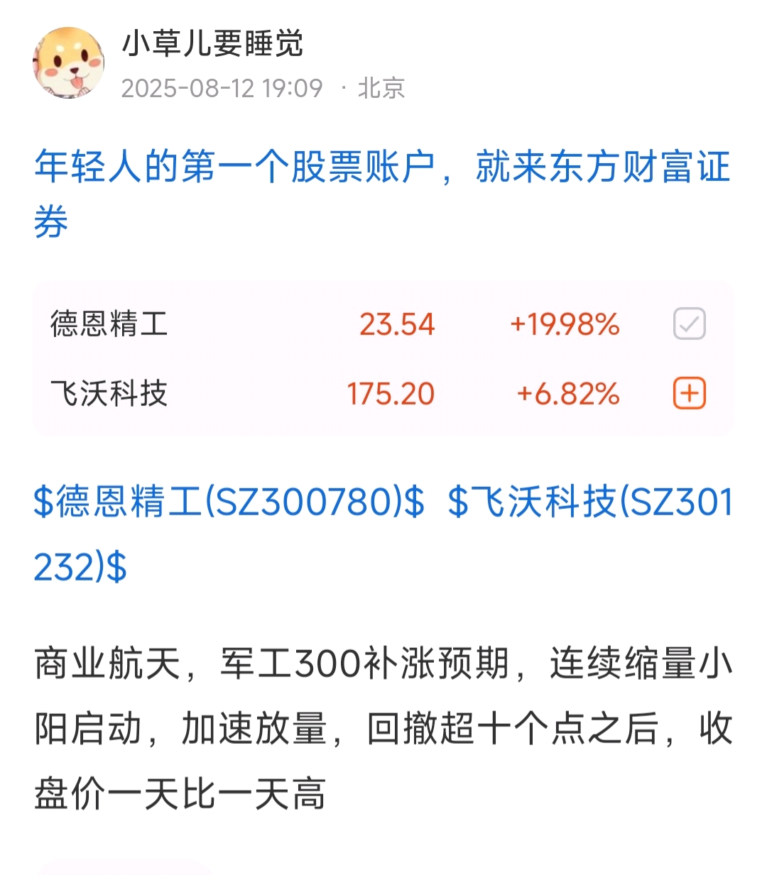 德恩没想到涨停了,去年八月份第一次聊商业航天就是飞沃,德恩
