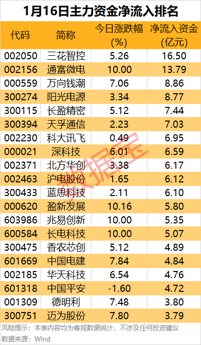 此外,还有万向钱潮、阳光电源、长盈精密、天孚通信、科大讯飞和深科技等主力资金净流入金额居前。