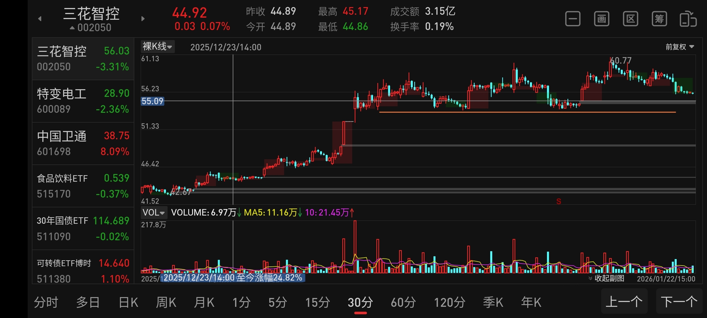 三花智控还得跌,30分钟级别55.09的放量阳线可以低吸30%的仓位,以有效跌破