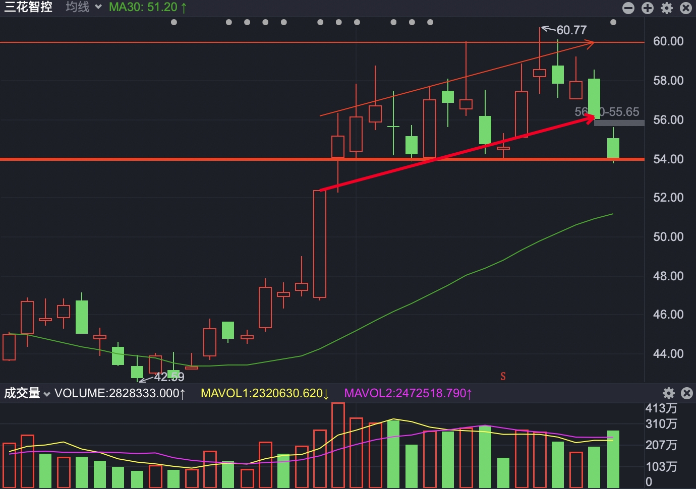 股价继续维持54-60元横盘震荡区间下沿,有望止跌企稳,向上震荡反弹。