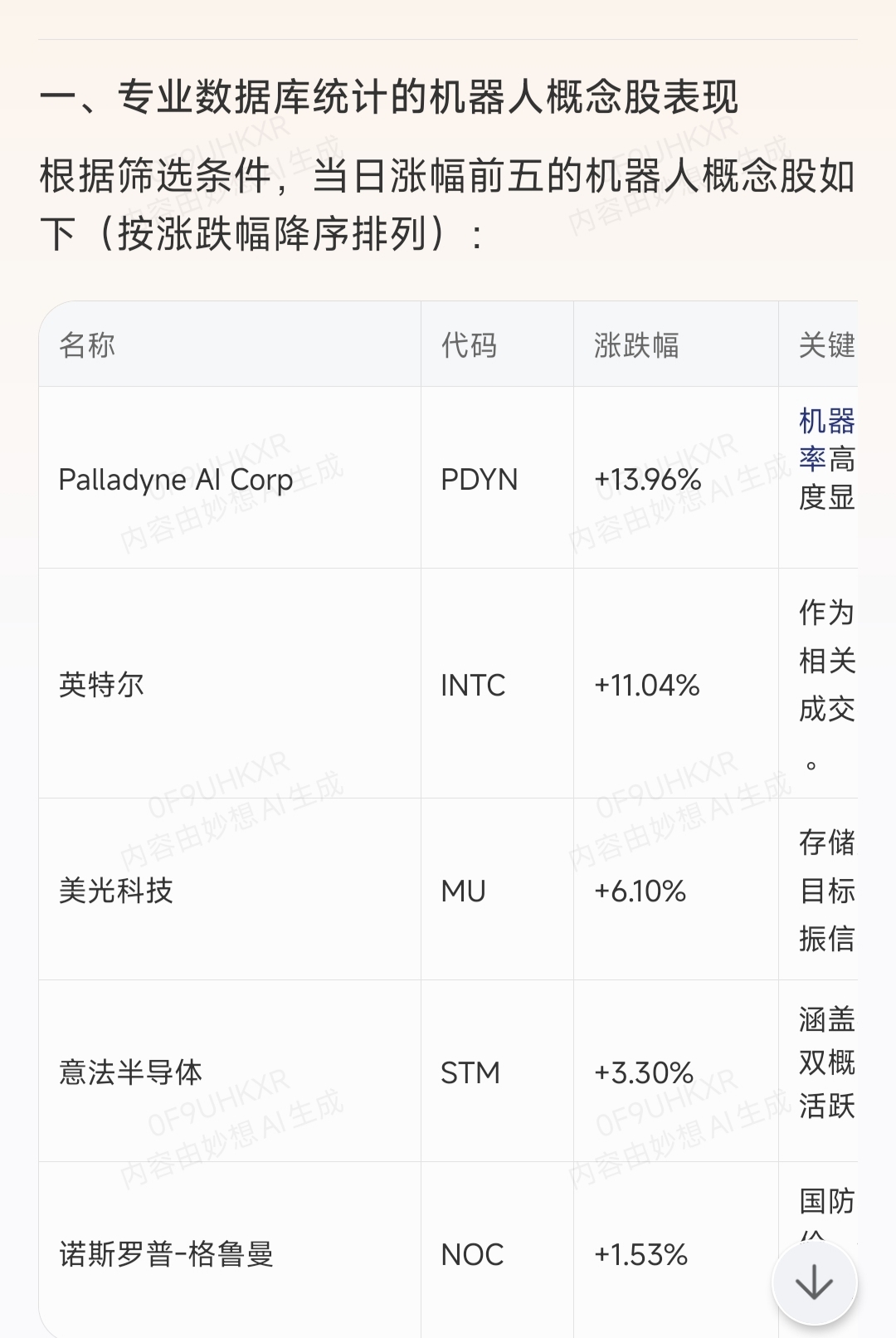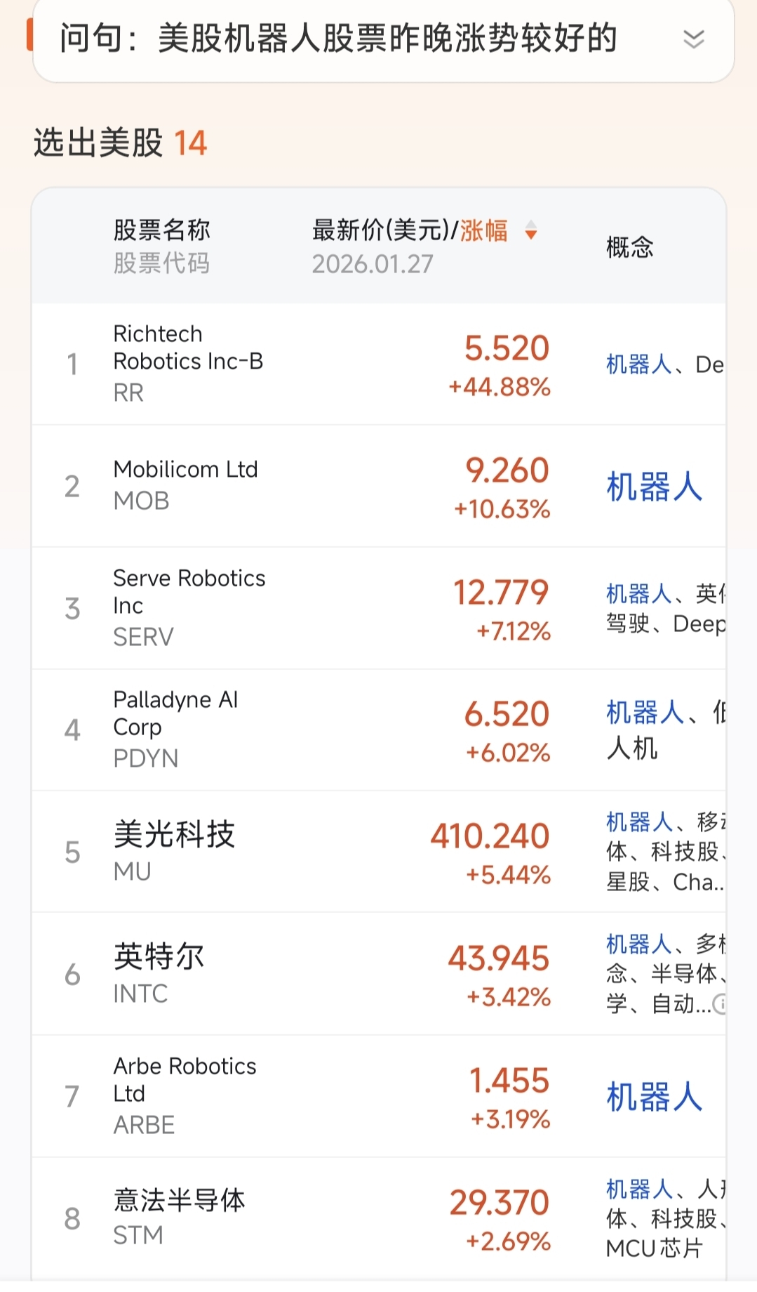 两张图,分别为27号和28号两个晚上丑丑那边的机器人概念股票个例走势,红色字体的
