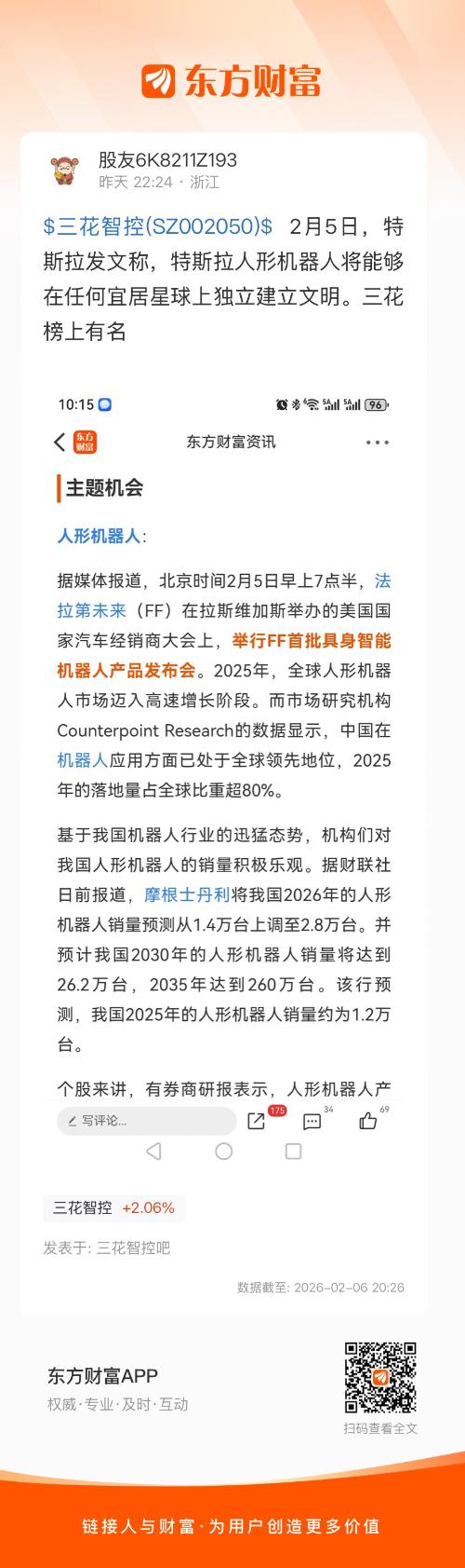 $三花智控(SZ002050)$  2月5日,特斯拉发文称,特斯拉人形机器人将能够在任何宜居星球上独立建立文明。三花榜上有名