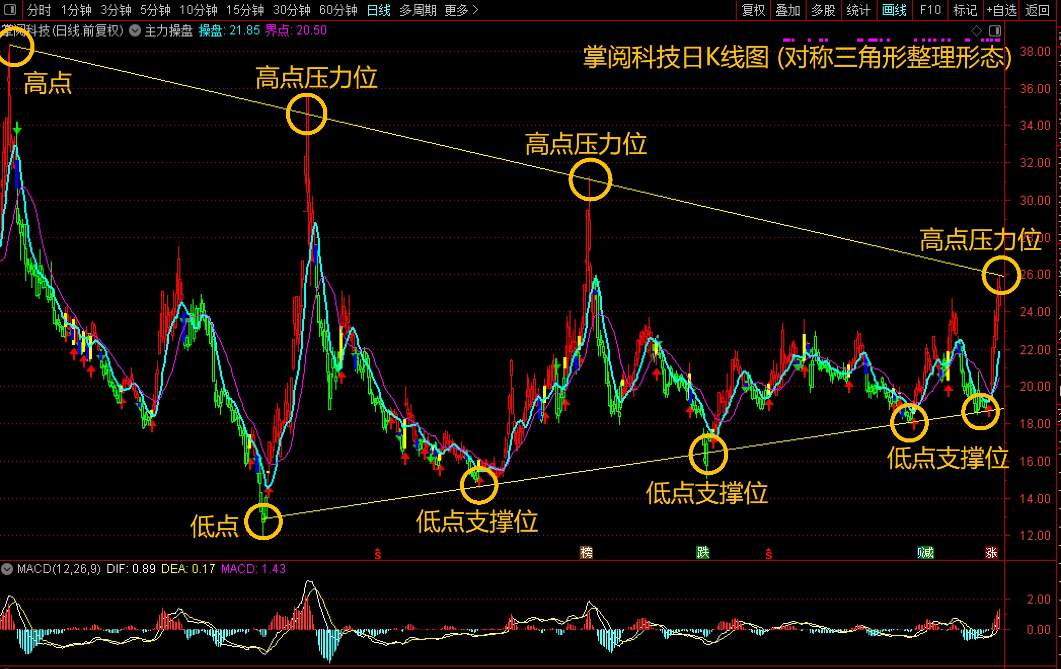 掌阅科技,对称三角形底部形态,目前股价已经来到三角形上边高点压力位附近,需关注能否有效放量突破,一旦放量滞涨便可能重回区间震荡,持仓需注意回落风险,及时采取降低风险措施。