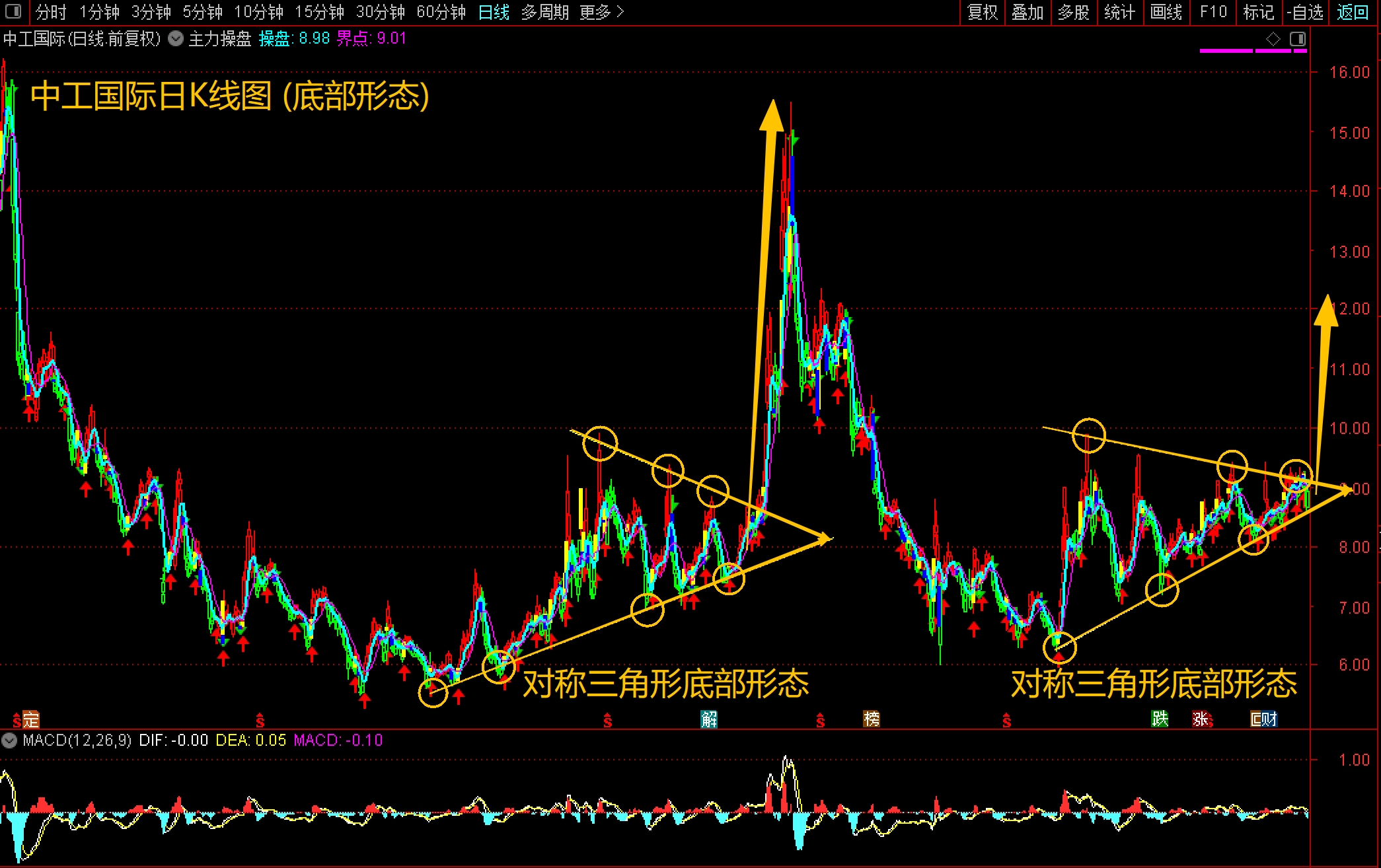 中工国际,对称三角形底部形态,只要在三角形内部运行不破位,耐心持有就行,放量突破后才有加速行情。
