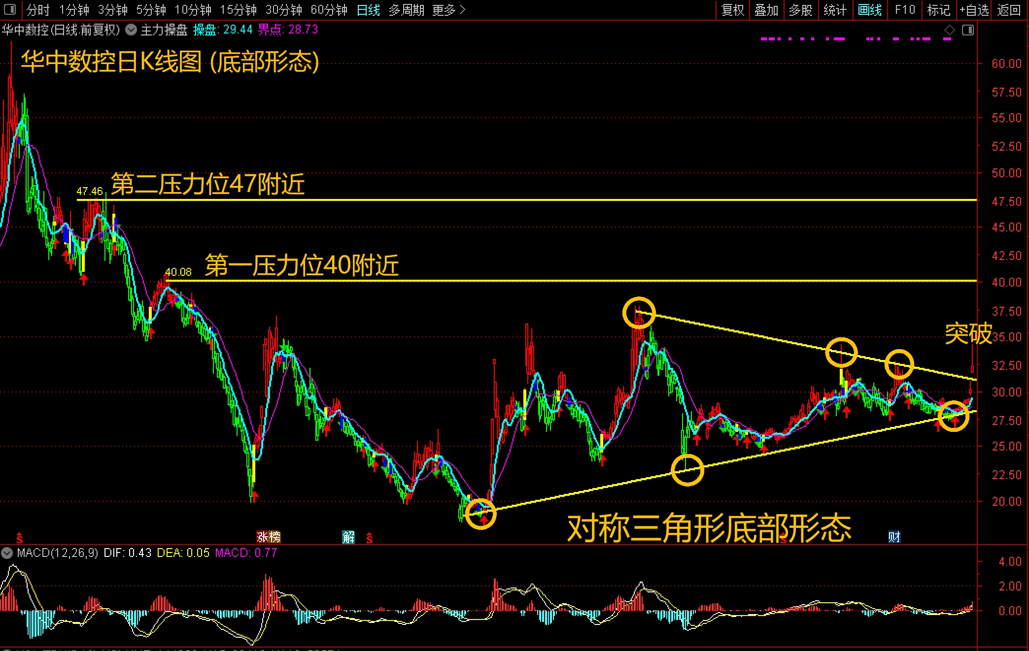 华中数控,对称三角形整理形态,放量突破后冲高回落,参考上方江湖规矩和传说口诀操作,关注MA5或MA10低吸机会。