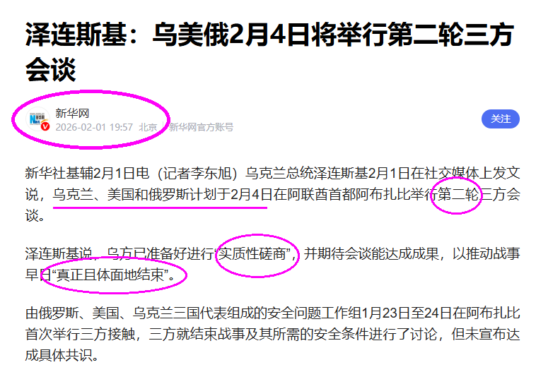 新华网:泽连斯基:乌美俄2月4日将举行第二轮三方会谈!