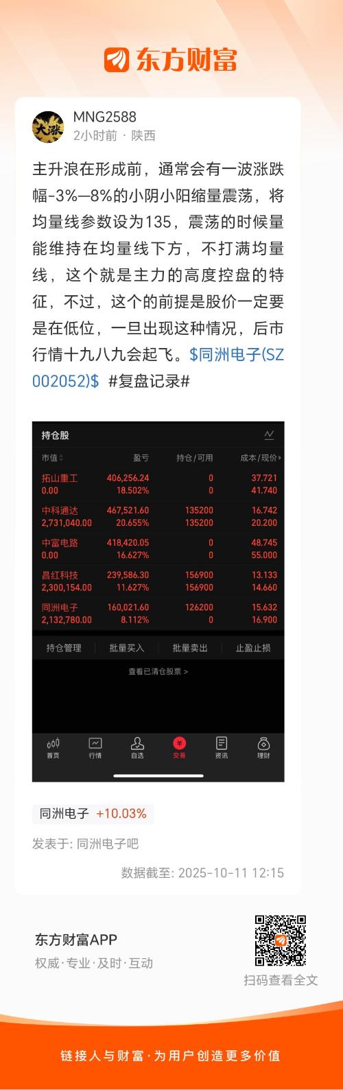主升浪在形成前,通常会有一波涨跌幅-3%—8%的小阴小阳缩量震荡,将均量线参数设为135,震荡的时候量能维持在均量线下方,不打满均量线,这个就是主力的高度控盘的特征,不过,这个的前提是股价一定要是在低位,一旦出现这种情况,后市行情十九八九会起飞。$同洲电子(SZ002052)$ #复盘记录#
