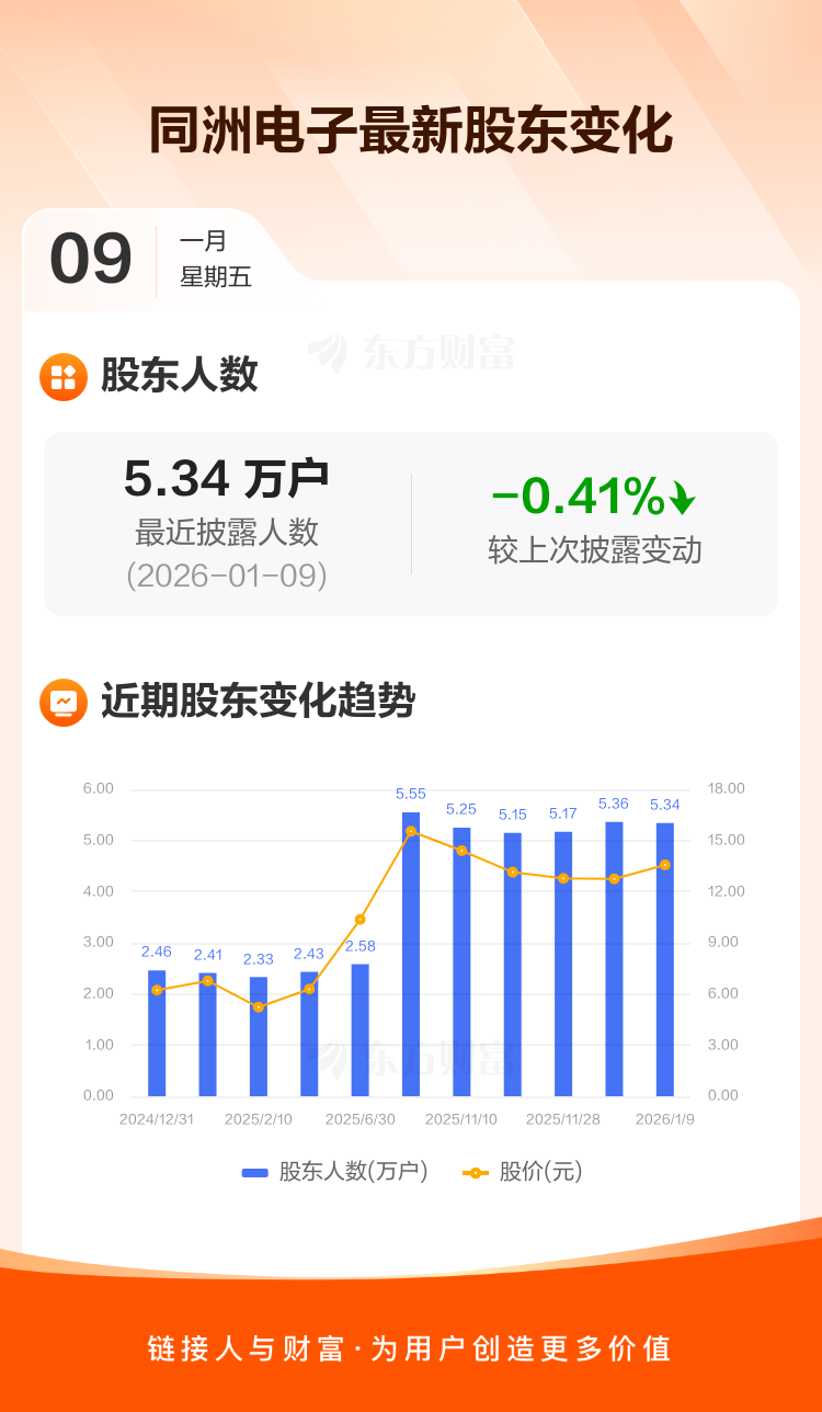 同洲电子最新披露数据显示,截至1月9日公司股东户数为5.34万户,较上期(2025年12月31日)减少219户,降幅为0.41%。户均持有流通股数量为1.29万股,与上期基本持平,户均持股金额由上期的16.40万元增加至17.52万元。