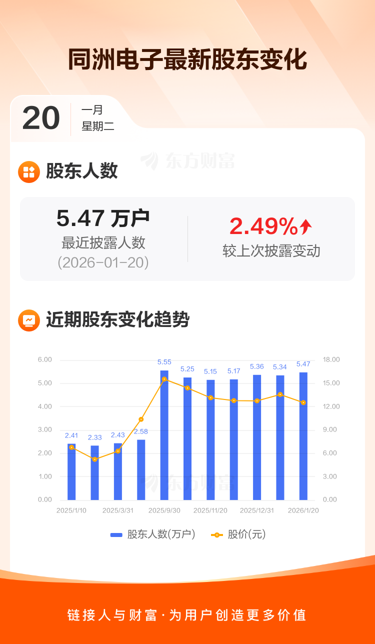 同洲电子最新披露数据显示,截至1月20日公司股东户数为5.47万户,较上期(2026年1月9日)增加1329户,增幅为2.49%。户均持有流通股数量由上期的1.29万股下降至1.26万股,户均持股金额由上期的17.52万元减少至15.78万元。