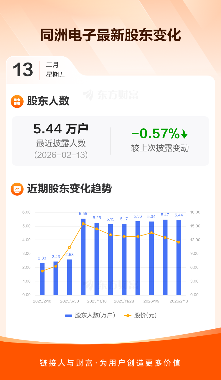 同洲电子最新披露数据显示,截至2月13日公司股东户数为5.44万户,较上期(2026年1月20日)减少313户,降幅为0.57%。户均持有流通股数量由上期的1.26万股上升至1.27万股,户均持股金额由上期的15.78万元减少至14.62万元。