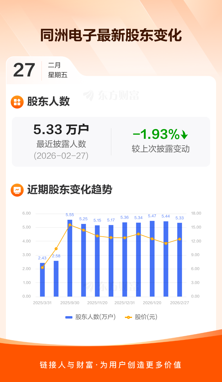 同洲电子最新披露数据显示,截至2月27日公司股东户数为5.33万户,较上期(2026年2月13日)减少1048户,降幅为1.93%。户均持有流通股数量由上期的1.27万股上升至1.29万股,户均持股金额由上期的14.62万元增加至16.11万元。