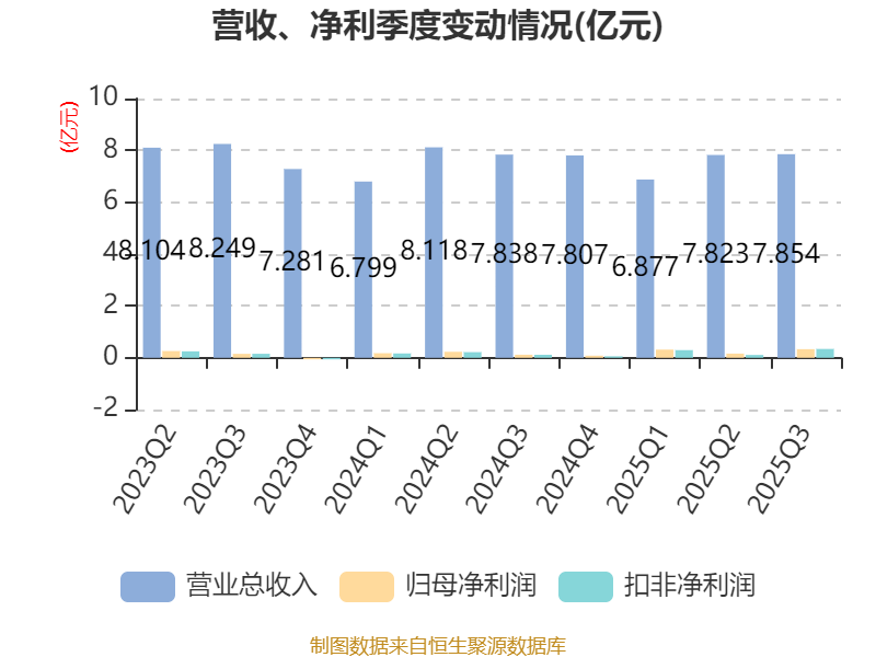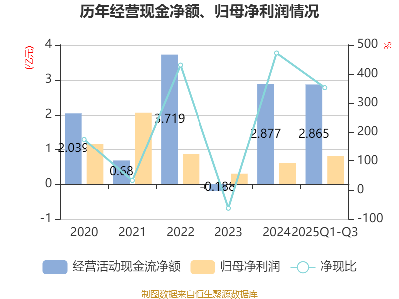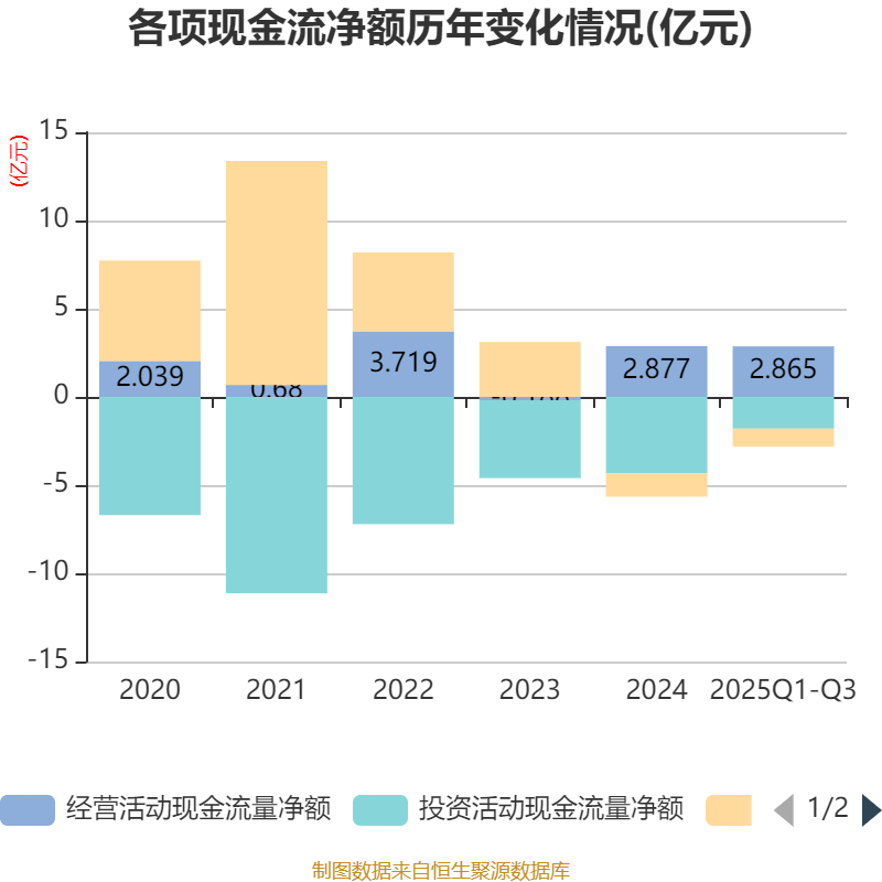 2025年前三季度,公司经营活动现金流净额为2.86亿元,同比增长46.19%;筹资活动现金流净额-1.02亿元,同比减少4017.63万元;投资活动现金流净额-1.8亿元,上年同期为-3.87亿元。
