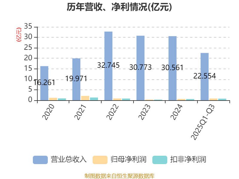 中证智能财讯德美化工(002054)10月24日披露2025年第三季度报告。前三季度公司实现营业总收入22.55亿元,同比下降0.88%;归母净利润8119.43万元,同比增长53.68%;扣非净利润7466.26万元,同比增长48.37%;经营活动产生的现金流量净额为2.86亿元,同比增长46.19%;报告期内,德美化工基本每股收益为0.172元,加权平均净资产收益率为3.28%。