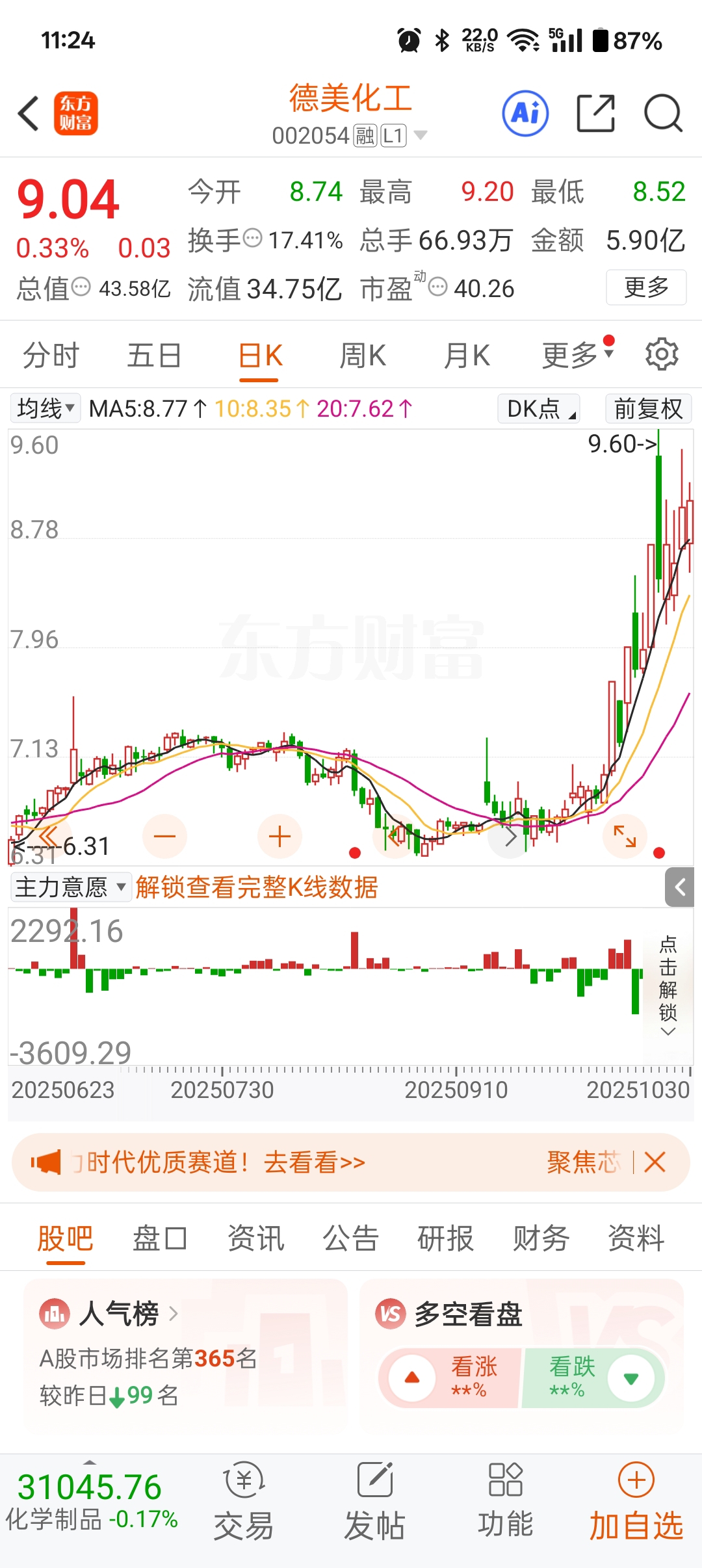 $德美化工(SZ002054)$ 玩股票几年还没见过这么恶劣的走势,上窜下跳的,赚不他一个钢镚。问题是我还买了