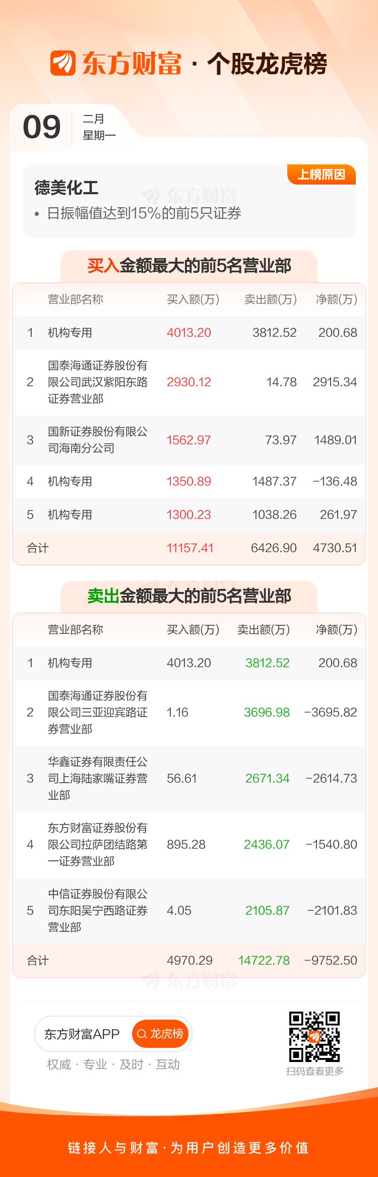 交易所2026年2月9日公布的交易公开信息显示,德美化工因成为日振幅值达到15%的前5只证券、连续三个交易日内,涨幅偏离值累计达到20%的证券上榜。德美化工当日收报11.06元,涨跌幅10.05%,偏离值15.09%,换手率27.71%,成交额11.17亿。异常期间2月5日至2月9日,期间涨幅23.03%,累计偏离值22.48%,区间成交额21.36亿。