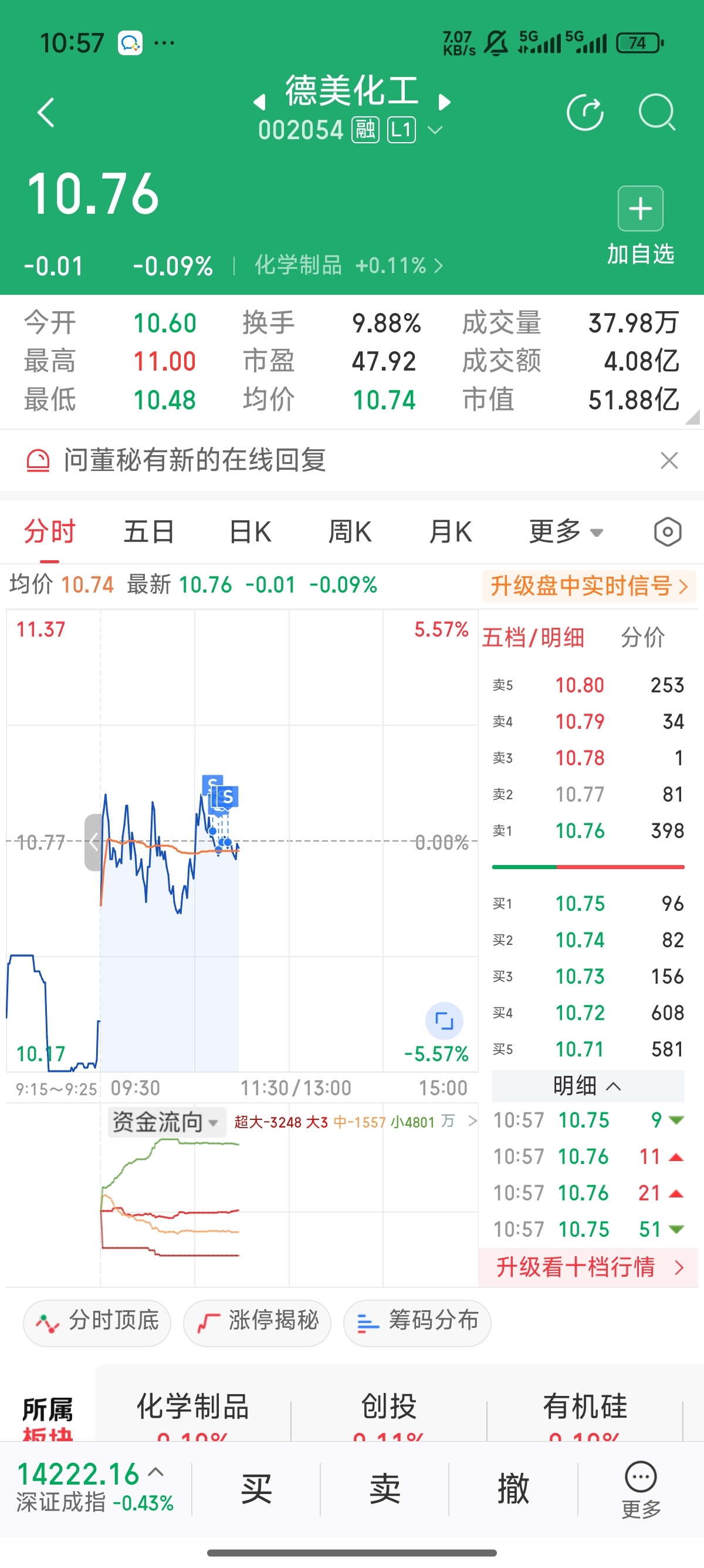 $德美化工(SZ002054)$ 昨天冲高没卖完,给恶心到了,今天跑完了,天天都是冲高回落玩