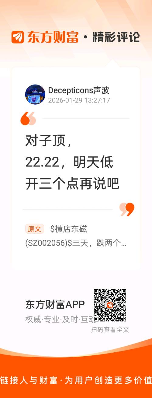 温馨提示: 1.根据《证券法》规定,禁止编造、传播虚假信息或者误导性信息,扰乱证券市场;2.用户在本社区发表的所有资料、言论等仅代表个人观点,与本网站立场无关,不对您构成任何投资建议。用户应基于自己的独立判断,自行决定证券投资并承担相应风险。《东方财富社区管理规定》